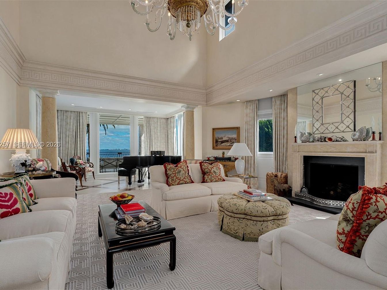 Bright and airy, this living room exudes sophistication with its high ceilings and elegant architectural details. Soft white sofas adorned with vibrant throw pillows invite relaxation, while a striking chandelier adds a touch of luxury. The rich, textured area rug enhances warmth beneath the coffee table, which is set with curated books and decorative items. Natural light floods in through expansive windows, offering serene views and connecting the indoors to the outside. Family-friendly elements include a plush ottoman for casual seating and a nearby grand piano, creating an inviting atmosphere perfect for gatherings and cherished moments.