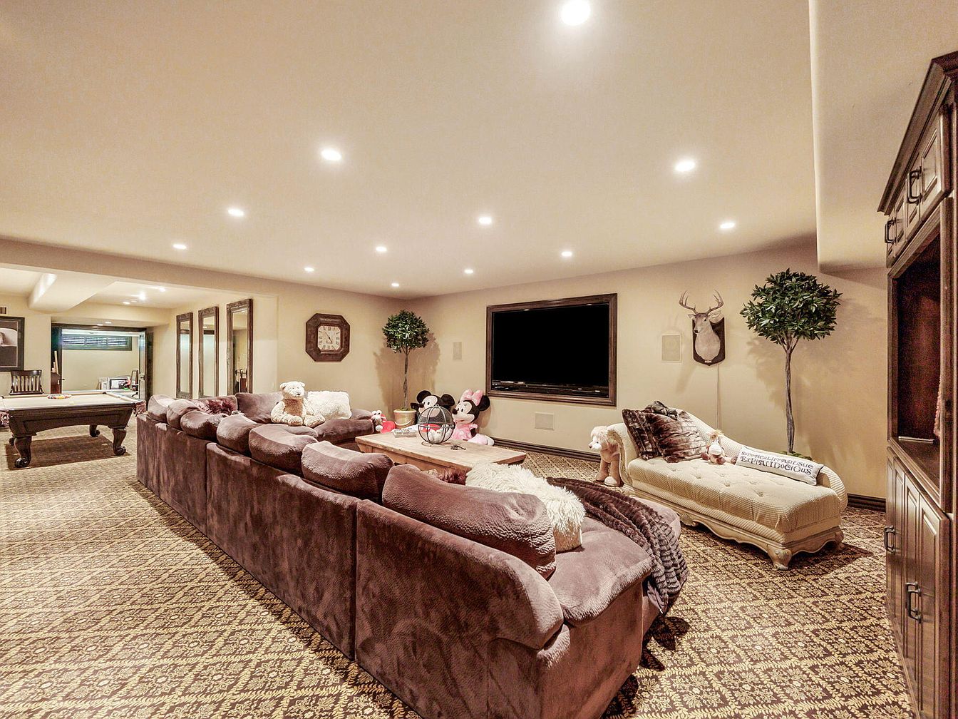 This inviting family room features a spacious layout, perfect for relaxation and entertainment. The plush brown sectional sofa is adorned with soft throw pillows, while a cozy chaise lounge invites curling up with a good book. A large television wall unit serves as the focal point, complemented by tasteful decor—including a mounted deer head and decorative plant. Soft overhead lighting enhances the warm atmosphere, alongside the intricate patterned carpet underfoot. Family-friendly touches like plush toys and a game area create a welcoming space, making it ideal for gatherings and leisurely evenings with loved ones.