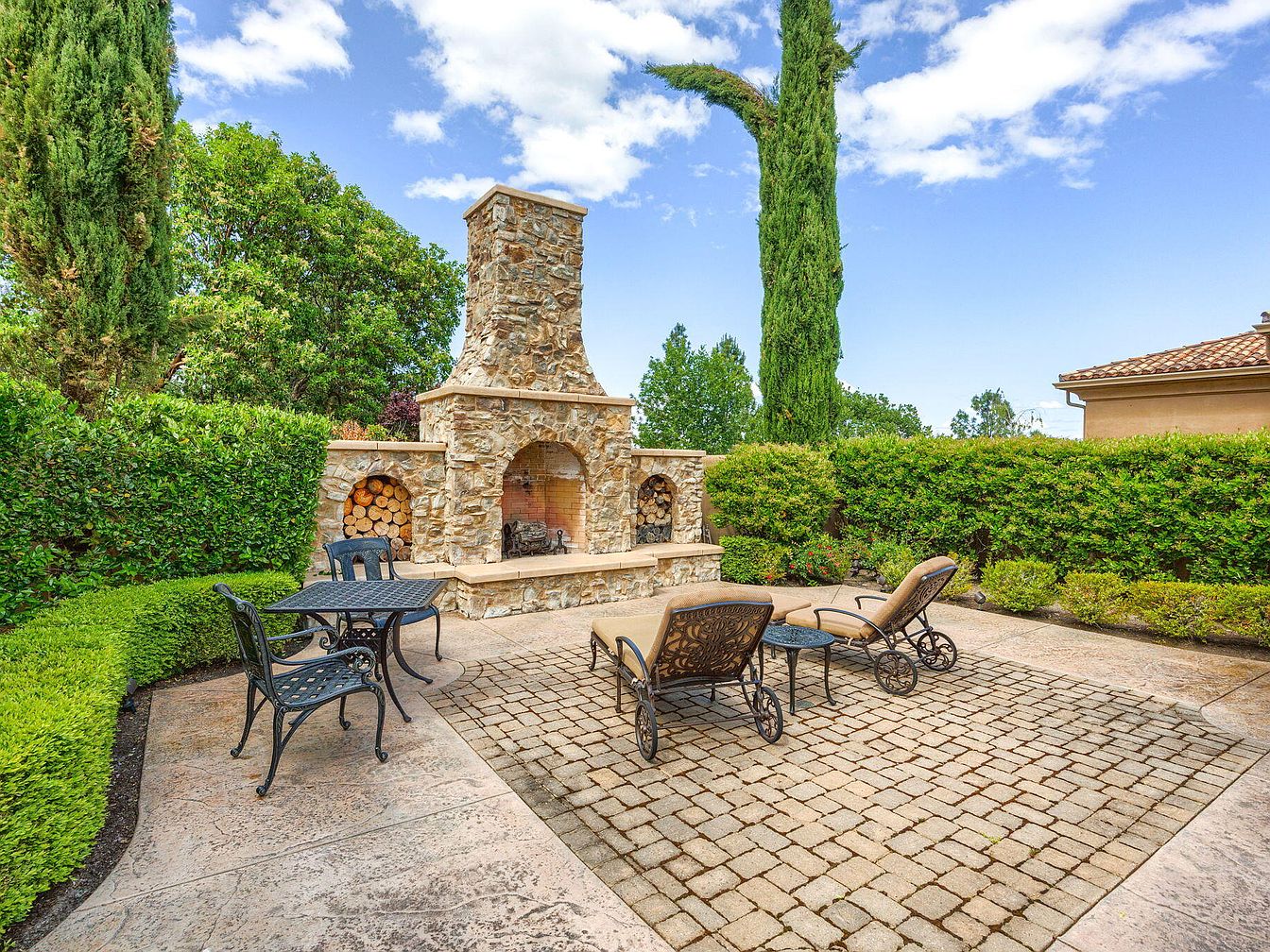 This inviting patio space features a stunning stone fireplace, perfect for gatherings and cozy evenings. Surrounded by lush greenery, the neatly trimmed hedges offer both privacy and a touch of nature. The area is thoughtfully laid out with stylish wrought-iron furniture, including a round table and comfortable loungers, ensuring ample seating for family and friends. The neutral tones of the stonework harmonize beautifully with the warm earth tones of the pavers. Natural light illuminates the space, enhancing the overall warmth, making it an ideal spot for relaxation or entertaining on sunny days.