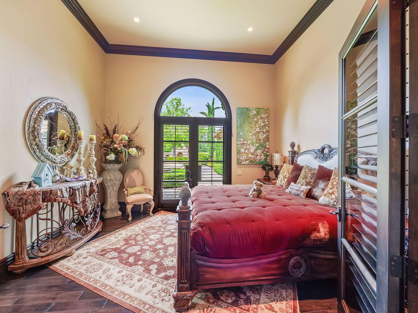 This elegant master bedroom combines comfort and sophistication, showcasing dark hardwood flooring that complements the rich, warm color scheme. A plush, tufted red bed serves as the focal point, adorned with decorative throw pillows for added coziness. Vintage-inspired furniture pieces, including a charming console table and an ornate mirror, enhance the room’s character. Soft lighting creates a serene atmosphere, while large windows with stylish shutters allow natural light to flood the space, offering views of the lush outdoor scenery. Delicate floral artwork adds a touch of nature, making this a perfect, family-friendly retreat to unwind.