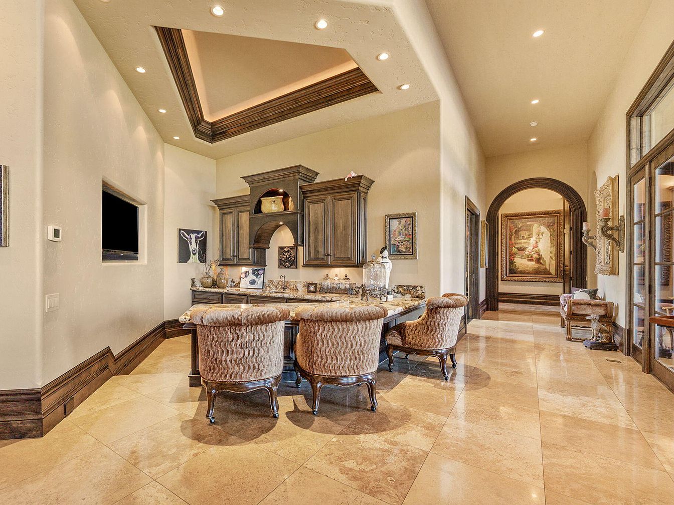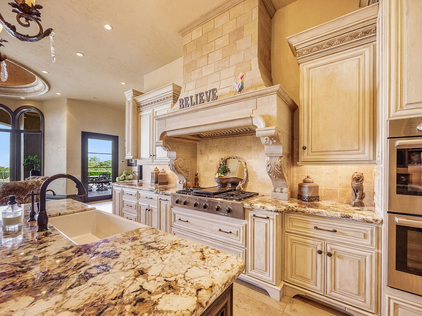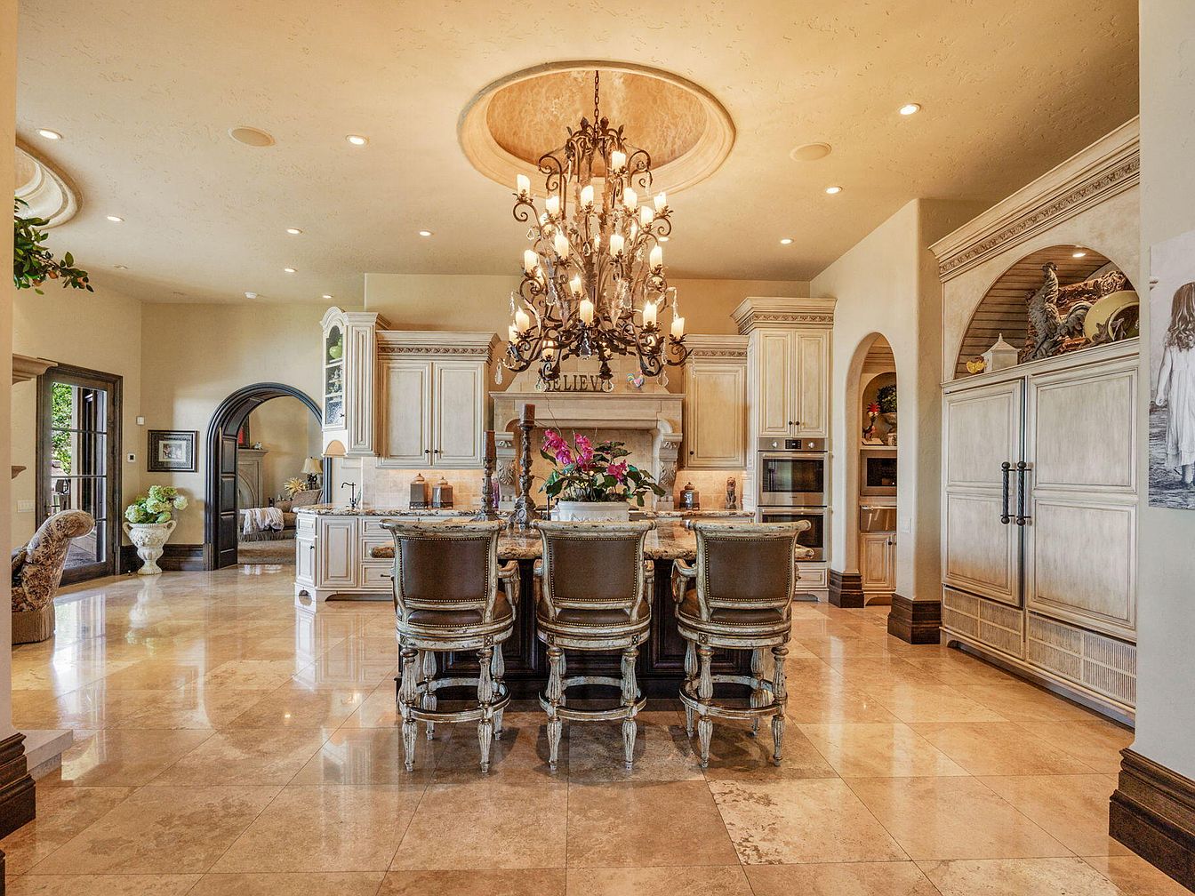 This stunning kitchen features an open layout that seamlessly merges sophistication with functionality. Warm, neutral tones are accented by luxurious stone countertops and intricate cabinetry, creating an inviting ambiance. The centerpiece is a grand chandelier, illuminating the space and adding a touch of opulence. Ample seating at the ornate island encourages family gatherings, while the polished marble floor enhances the overall elegance. Architectural details such as arched openings and decorative motifs are harmoniously integrated, providing a classic yet modern feel. The combination of aesthetic appeal and practicality makes this kitchen perfect for culinary adventures and social entertaining.