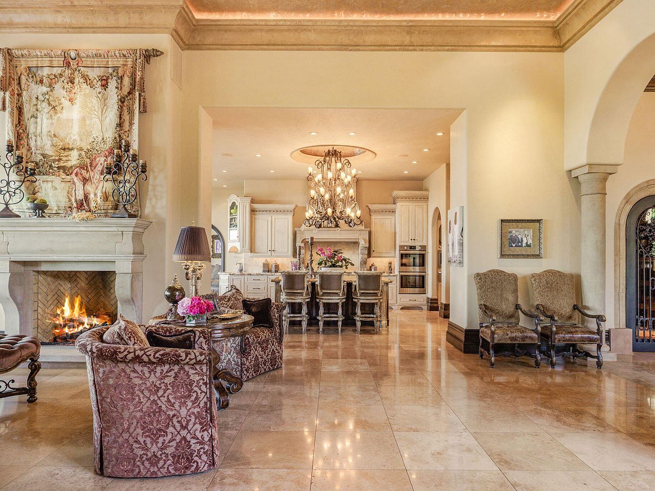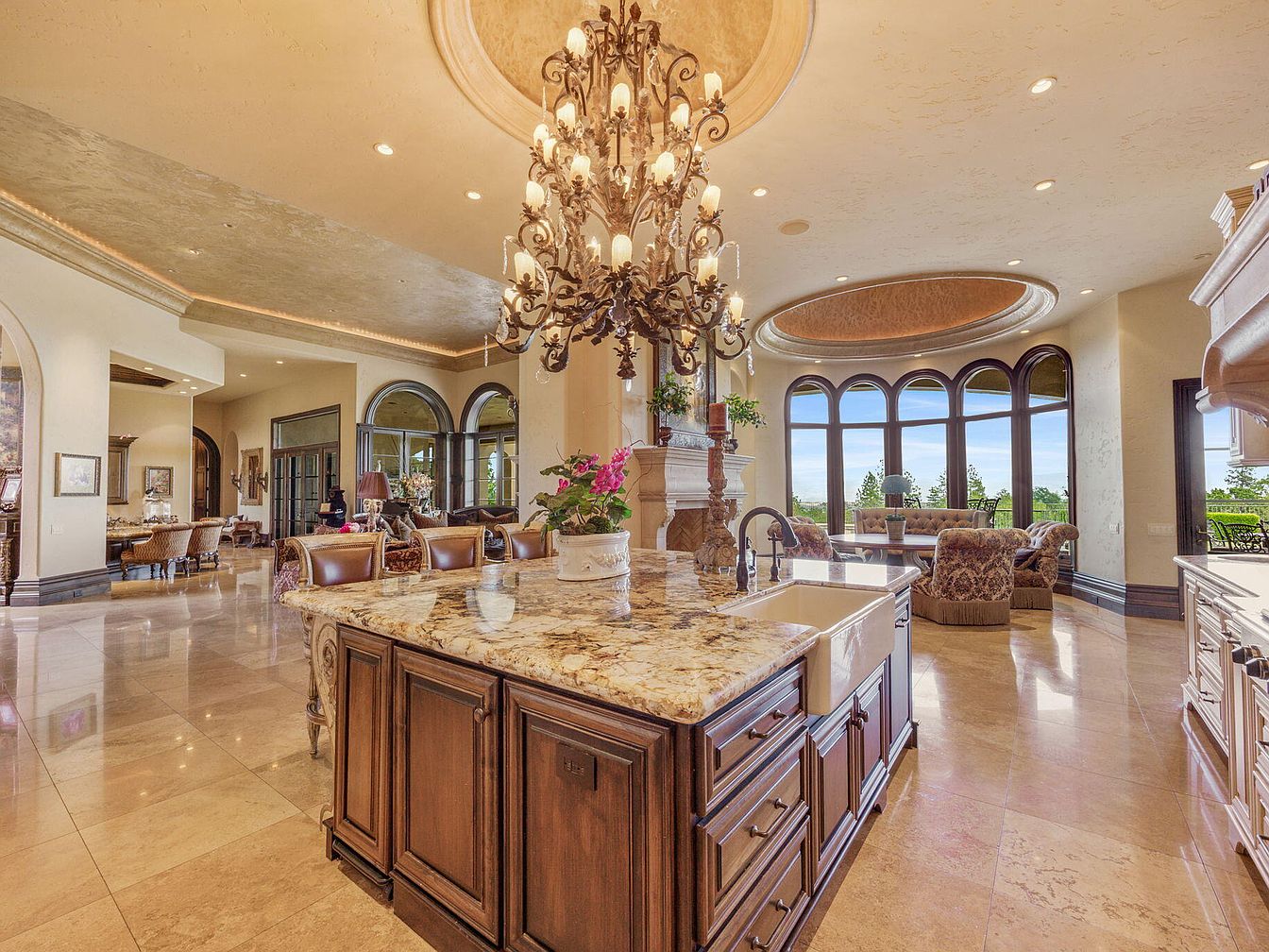 A stunning open concept kitchen seamlessly blends with the living area, showcasing an elegant design. The centerpiece is a large, richly detailed island with a beautifully patterned granite countertop, ideal for family gatherings and casual dining. Natural light floods the space through expansive arched windows, enhancing the warm color palette of earthy tones and creamy neutrals. Luxurious chandeliers hang from the ornate ceiling, creating an inviting ambiance. The well-appointed cabinetry provides ample storage, while the polished marble floors reflect the sophistication of the room. This design is perfect for entertaining and family connection, marrying convenience with beauty.