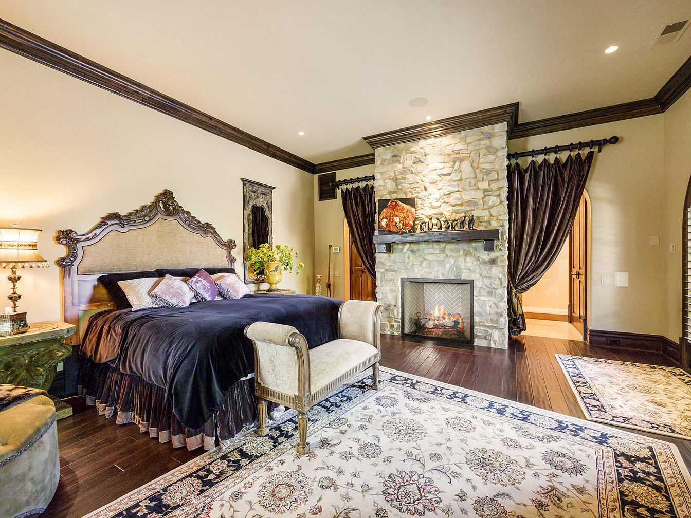 This master bedroom exudes sophistication and warmth, featuring a majestic wooden bed framed by an ornate headboard and plush bedding embellished with rich textures. The space is anchored by a striking stone fireplace, providing both aesthetic appeal and comfort during cooler months. Deep plum curtains cascade elegantly, enhancing the room’s cozy atmosphere while allowing for privacy. Elegant furnishings include a sophisticated armchair and chic nightstands adorned with decorative lamps, creating a perfect blend of style and functionality. The intricate area rug complements the wooden floors, enriching the room’s textures and color palette, making it an inviting retreat.