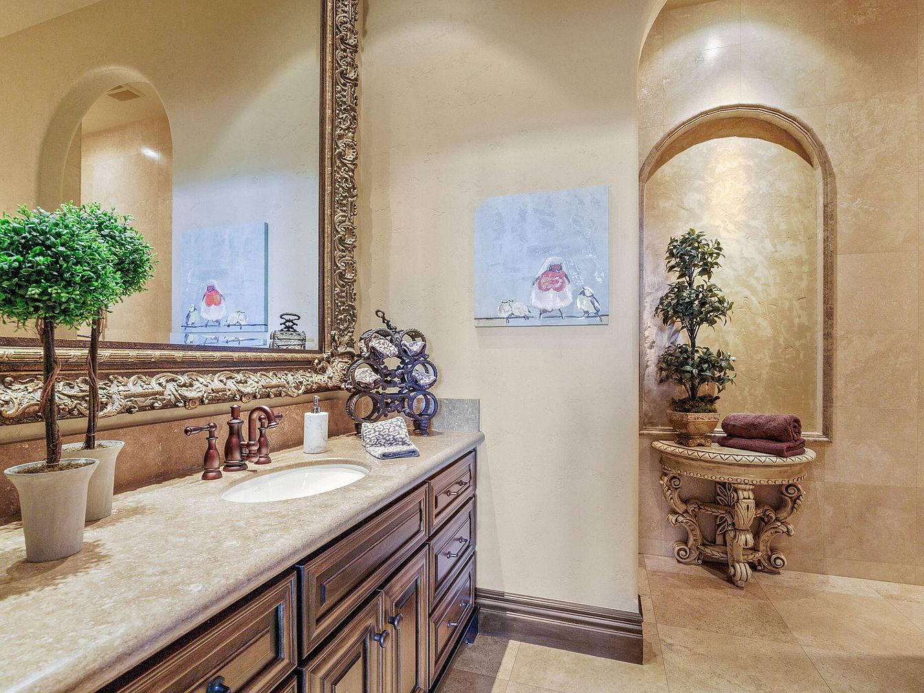 Featuring a lavish double sink, this bathroom excels in both functionality and aesthetics. Classic wooden cabinetry complements the elegant granite countertop, offering ample storage for toiletries. The ornate mirror enhances the luxury, while the soft beige stone walls create a soothing ambiance. Decorative elements like potted greenery and tasteful artwork add personality and warmth, contributing to a welcoming feel. The arched niches, elegantly lit, display more greenery and plush towels, perfect for a family-friendly environment. Rustic bronze fixtures provide a timeless touch, making this space not only stylish but also practical for everyday use.