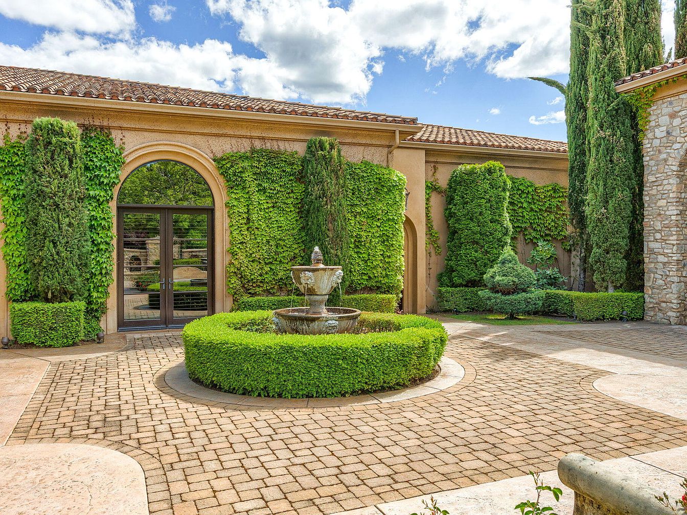 The garden entrance showcases a stunning, meticulously designed courtyard highlighted by lush greenery and an elegant stone fountain. Framed by vibrant climbing vines and manicured hedges, the entrance exudes tranquility and charm. The cobblestone path guides visitors to the double doors, inviting them into the home. Tall cypress trees add height and structure, while soft landscaping creates a warm, welcoming atmosphere. The earthy color palette of browns and greens harmonizes beautifully with nature, making this outdoor space ideal for family gatherings or quiet reflection. Architectural details, such as the arched doorway, enhance the home’s sophisticated curb appeal.