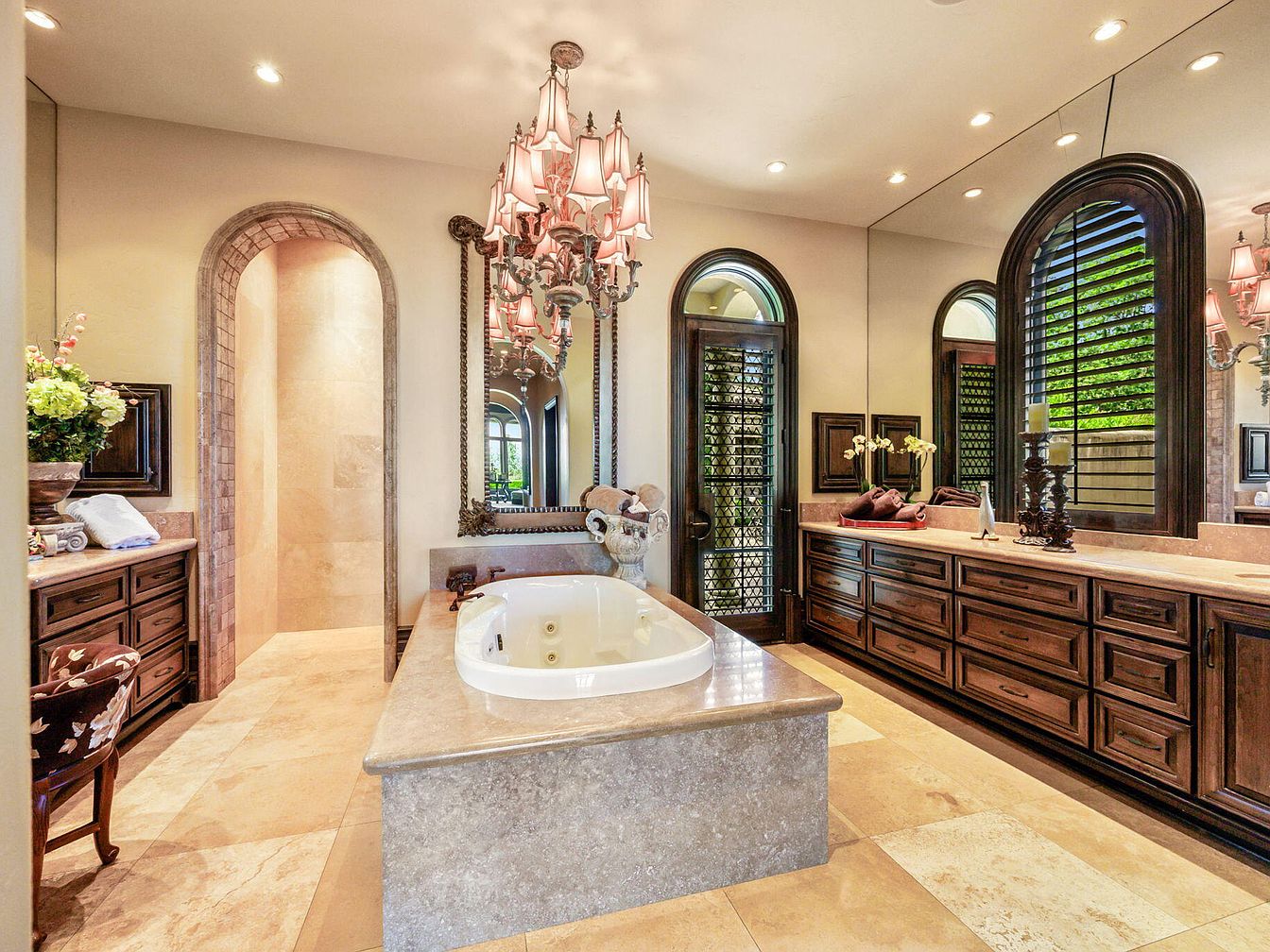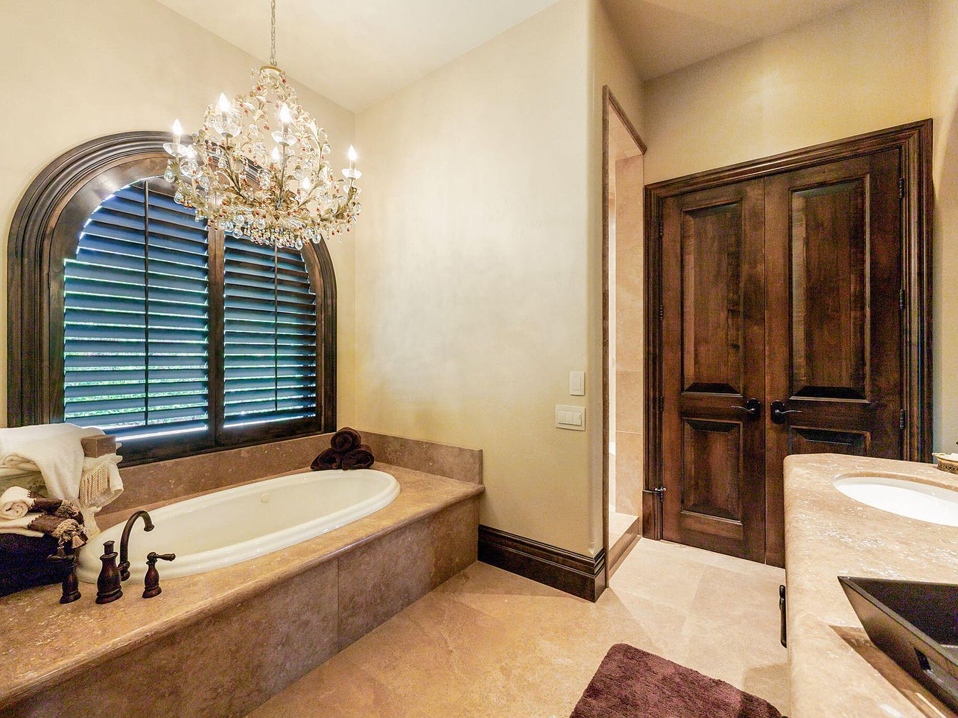 This luxurious bathroom features a spacious layout, exuding sophistication and comfort. A deep soaking tub sits against a rich marble counter, complemented by plush towels and a stylish black faucet. A stunning chandelier illuminates the space, while the large arched window, adorned with dark wooden shutters, invites natural light and offers a serene view. Warm, neutral colors harmonize with dark wood accents, creating a cozy yet elegant atmosphere. The double sink vanity provides ample space for convenience, making this inviting bathroom perfect for families. Thoughtfully designed, this retreat balances functionality with timeless beauty.