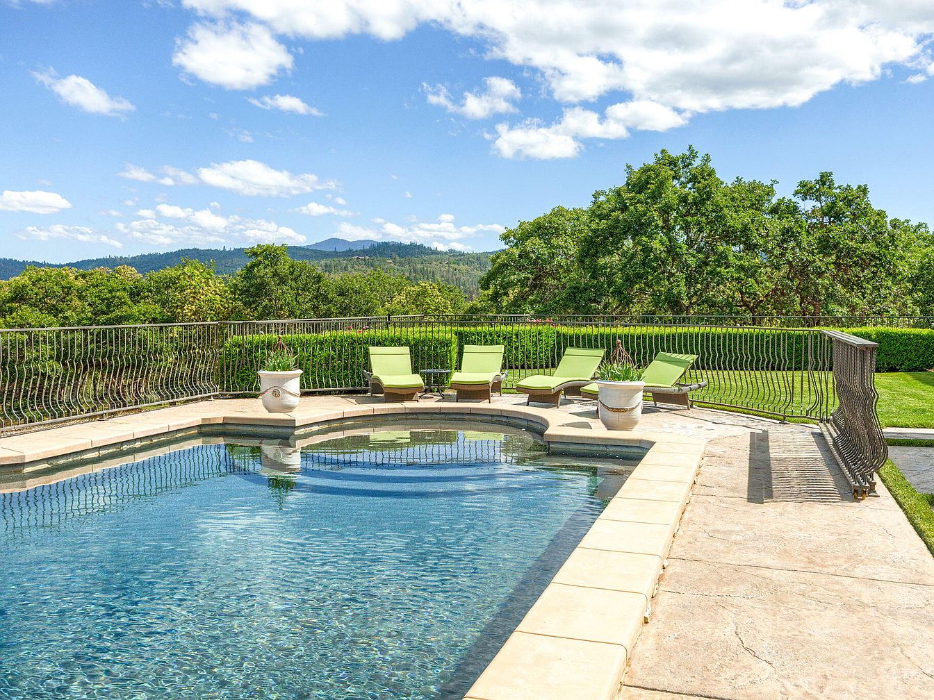 This stunning poolside retreat offers a serene oasis, blending luxury and comfort. The inviting swimming pool features a beautifully structured design with a gentle curve, reflecting the clear blue skies above. Surrounding the pool, modern lounge chairs in a vibrant green hue add a pop of color and encourage relaxation. The stone patio seamlessly connects to manicured lawns, providing ample space for outdoor activities. Elegant wrought iron railings frame the area, enhancing safety while maintaining an open feel. Lush trees in the background create a picturesque backdrop, emphasizing the home’s harmonious integration with nature and the outdoor lifestyle.
