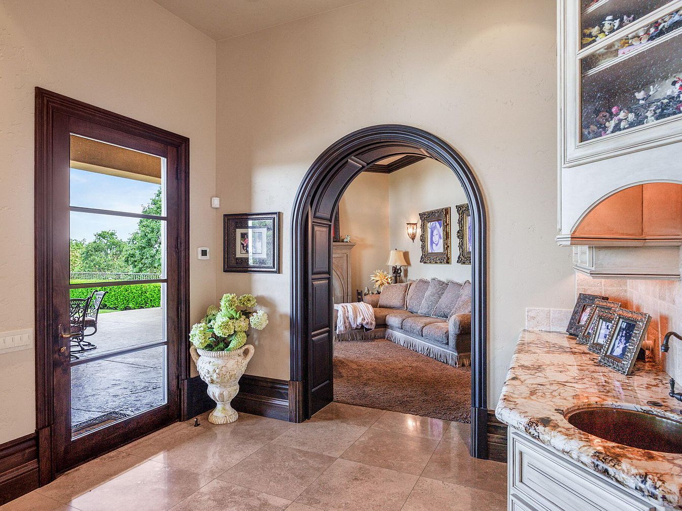 This stunning entryway exudes sophistication with its grand arched door framed by intricate wrought iron details that invite natural light. The spacious layout features polished marble flooring that reflects the soft, warm hues of the cream-colored walls and rich wooden accents, establishing a welcoming atmosphere. To the left, an elegant dining space showcases upholstered chairs and a lavish chandelier, perfect for family gatherings. Architectural columns add a classic touch, while framed art on the walls complements the home’s refined aesthetic. This entryway seamlessly connects to the living areas, creating a fluid transition throughout the inviting home.