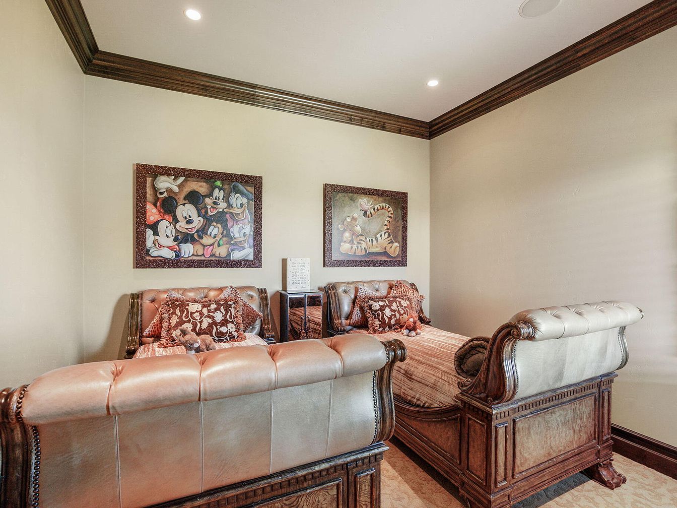 This charming kid’s bedroom features elegant twin beds with luxurious tufted headboards, offering both comfort and style. The room is meticulously designed with a warm color palette, blending soft tans with rich wooden accents, enhancing the welcoming atmosphere. Playful artwork showcasing beloved animated characters adds a touch of whimsy on the walls, appealing to young imaginations. Plush decorative pillows and cozy bedding provide additional comfort, while the intricate woodwork along the crown molding adds sophistication. Functional lighting ensures a bright, cheerful space for reading or play, making this bedroom not only stylish but also wonderfully family-friendly.