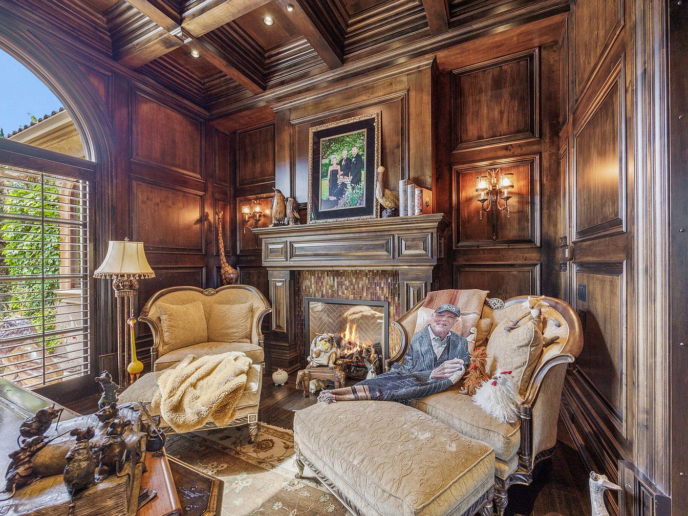 This inviting living room exudes warmth and elegance with its rich wood-paneled walls and intricate ceiling details. A plush, vintage-style armchair and a coordinating chaise lounge provide a perfect spot for relaxation, decorated with soft throws and patterned pillows. The fireplace, surrounded by a decorative mantel, adds a focal point that enhances the cozy atmosphere, complemented by ambient lighting from charming sconces. A large window invites natural light, showcasing lush greenery outside, while artisanal sculptures and a detailed rug contribute to the room’s family-friendly charm and character, making it ideal for gatherings and quiet evenings alike.