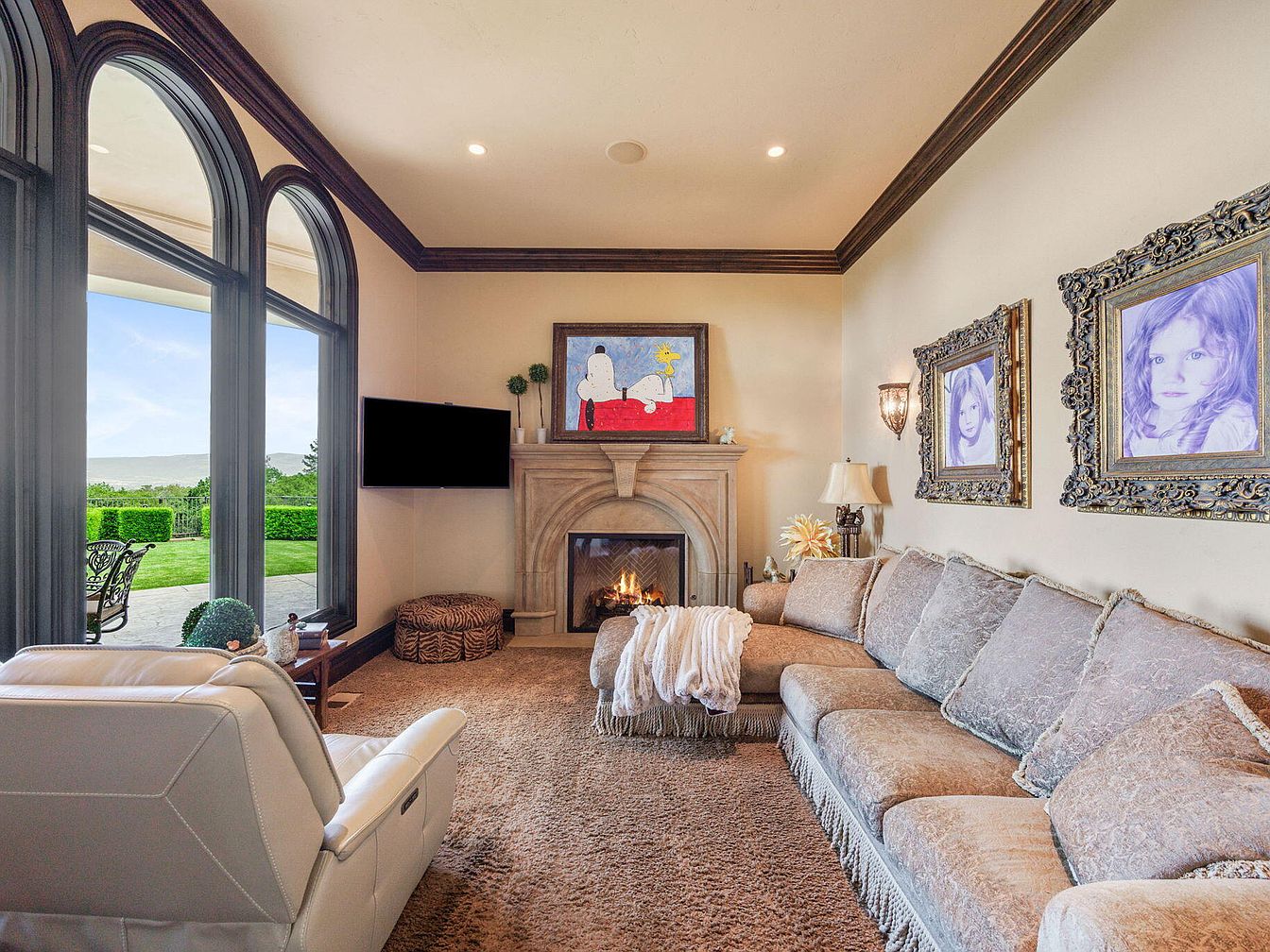 This inviting living room exudes comfort with its warm color palette and plush furnishings. A spacious sectional couch, adorned with decorative pillows, centers the room, while a soft, shaggy rug adds warmth underfoot. Majestic arched windows frame picturesque views of the greenery outside, flooding the space with natural light. The elegant fireplace, featuring a detailed stone mantle, creates a cozy focal point. Flanked by artful portraits in ornate frames, the walls boast intricate crown molding, enhancing the room’s architectural charm. Family-friendly features like a sturdy coffee table and comfortable seating make this space perfect for gathering and relaxation.