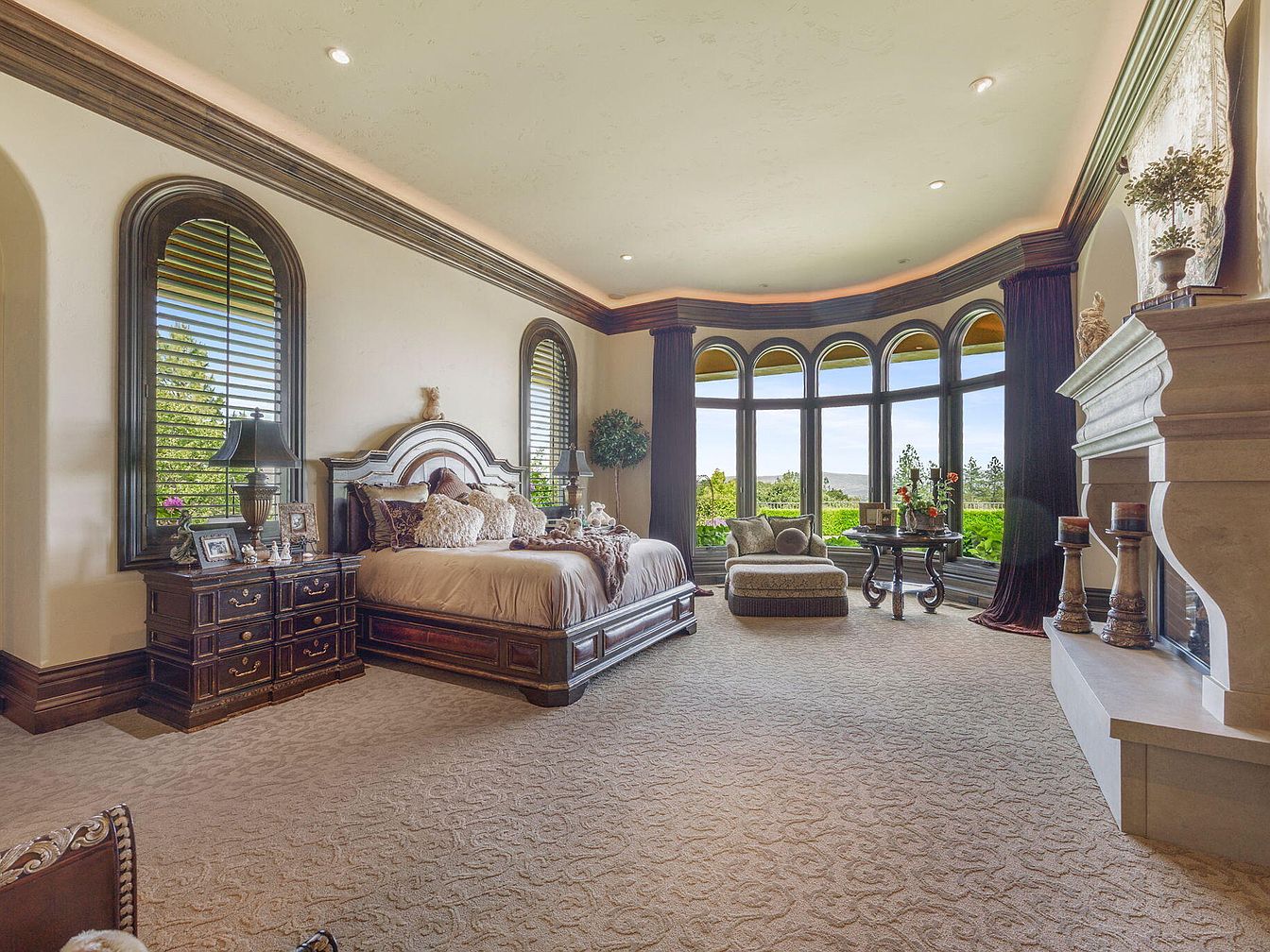 The master bedroom exudes elegance with its rich, dark wood accents and plush furnishings. A grand, intricately designed bed frames the space, complemented by a beautifully arranged ensemble of soft pillows and throws. Arched windows flanked by luxurious drapes invite natural light, offering picturesque views of the landscape. The warm, neutral color scheme enhances a serene atmosphere, while ornate details in the crown molding and fireplace enrich the architectural charm. A cozy seating area provides a perfect spot for relaxation, making this space not only lavish but also embracing family-friendly comfort for unwinding or intimate gatherings.