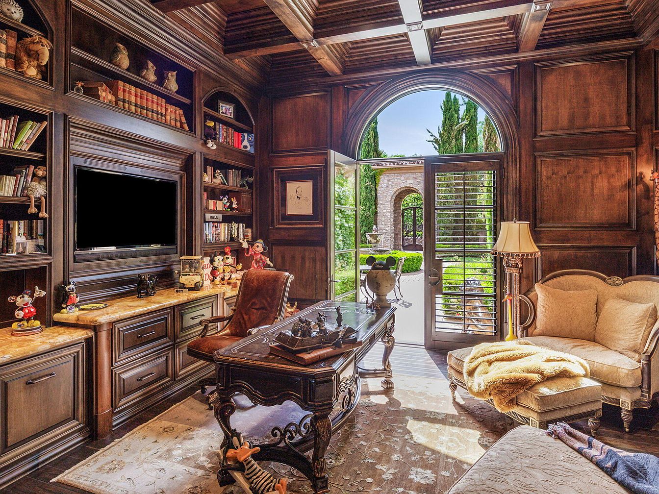 This sophisticated home office exudes elegance with its rich wooden cabinetry and warm color palette. Featuring a sturdy wooden desk adorned with decorative accents, the space is designed for both productivity and comfort. The built-in shelves house an eclectic mix of books and charming collectibles, adding a personal touch. Natural light floods in through a grand arched window, revealing lush greenery outside, enhancing the inviting atmosphere. A plush seating area with a cozy throw invites relaxation, while the carefully chosen decor creates a sense of harmony, making this office a perfect blend of work and leisure.