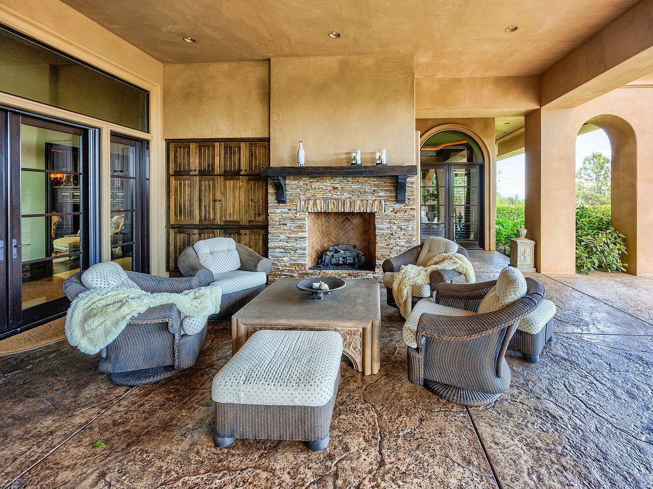 A welcoming outdoor living space perfect for relaxation and gatherings. This area features a cozy stone fireplace as a focal point, enveloped by comfortable, plush seating. The natural tones of the furniture and textured stone surround create a harmonious aesthetic with the earthy walls. A large, rustic table invites communal dining or casual games, while soft throws add warmth and comfort. The layout is spacious, ensuring easy movement and a family-friendly atmosphere. Large windows and open archways merge indoor and outdoor living, allowing for abundant natural light and scenic views of the surrounding greenery.
