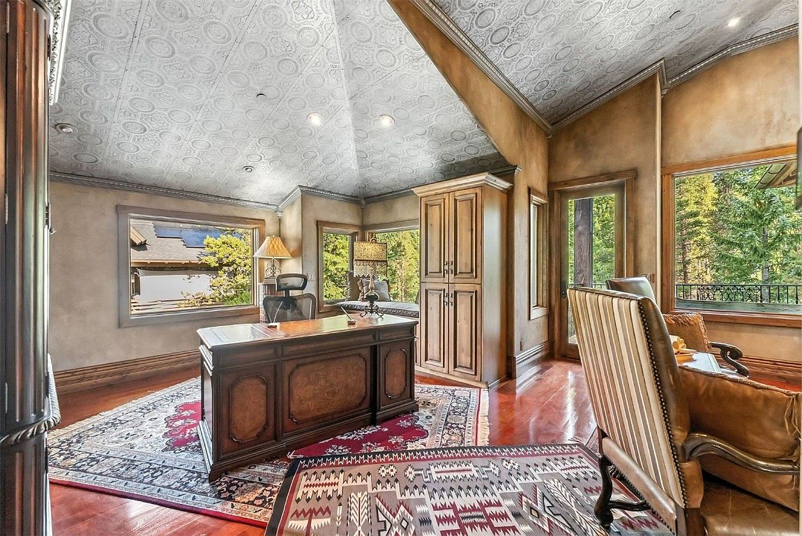 This luxurious home office exudes sophistication with its stunning architectural details and warm color palette. The vaulted ceiling features an intricate design that draws the eye upward, enhancing the spacious feel. Rich wooden flooring complements the elegant furnishings, including a classic wooden desk and plush seating. Large windows invite natural light, offering scenic views of the surrounding greenery, while providing a peaceful atmosphere. The strategically placed lamp adds warmth for evening work, and patterned rugs underneath lend a touch of character. With a blend of comfort and professional atmosphere, this space is ideal for both productivity and inspiration.