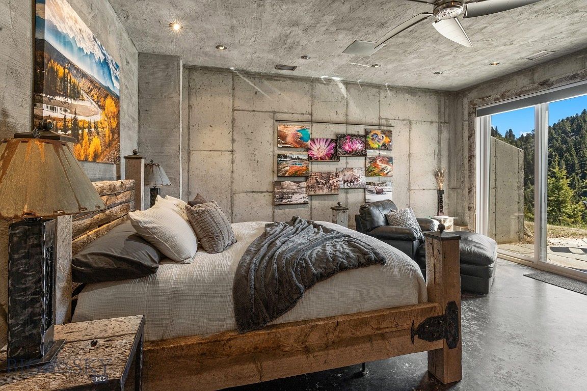 A spacious master bedroom perfectly blends modern industrial style with cozy comfort, featuring exposed concrete ceilings, prominent metal ventilation, and expansive floor-to-ceiling windows offering panoramic mountain views. The room’s neutral palette of grays, creams, and natural wood tones creates a serene atmosphere, complemented by a rustic wooden bed adorned with a plush faux fur blanket. A large leather chaise and nature-inspired decor invite relaxation and family time. Thoughtfully placed lamps and soft textiles enhance warmth, while the open layout ensures plenty of space for personal retreat or gathering with loved ones. The breathtaking scenery becomes part of daily living.