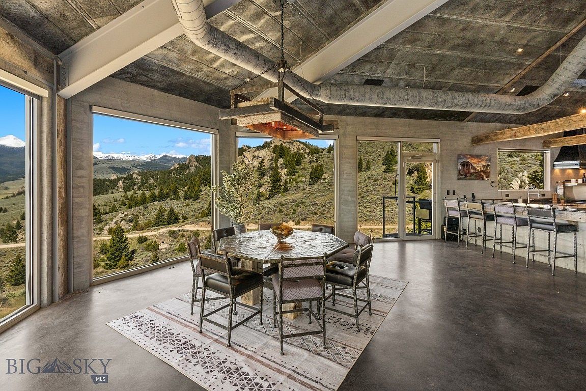 Expansive floor-to-ceiling windows frame sweeping mountain vistas, filling the dining area with natural light and connecting the space to nature. A sturdy round table with seating for six sits atop a patterned area rug, providing a perfect setting for family meals or game nights. Industrial features are showcased through exposed ductwork and raw concrete finishes, balanced by the warmth of wood accents and a geometric chandelier. The open-concept layout flows into the kitchen with bar seating nearby, encouraging social gatherings. Minimalist décor ensures the remarkable landscape remains the focal point, creating a harmonious and family-friendly environment.