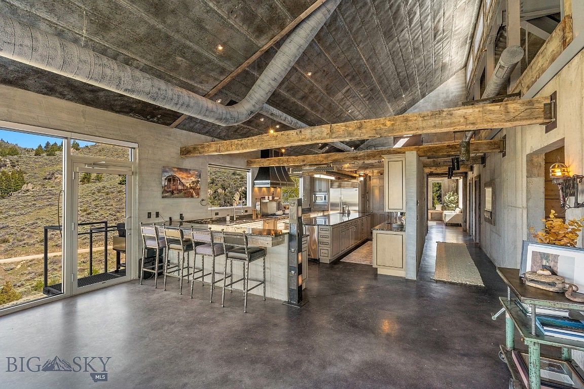 Expansive kitchen area featuring a striking blend of rustic and industrial design elements, with exposed beams, ductwork, and high vaulted ceilings. Large windows and glass doors fill the space with natural light and provide breathtaking views, promoting a connection to the outdoors. The kitchen island includes ample bar seating, perfect for family gatherings or casual meals. Warm-toned cabinetry, gleaming stainless steel appliances, and unique lighting fixtures enhance the contemporary-meets-country feel of the room. The open floor plan ensures a welcoming atmosphere for entertaining, while durable finishes and spacious layouts cater to active family living and practicality.