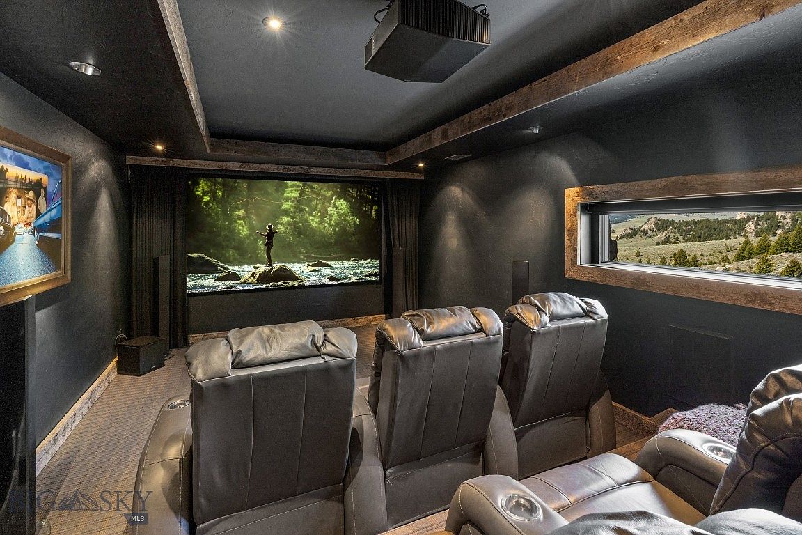 A luxurious home theater room designed for family entertainment, featuring multiple rows of plush black leather recliners equipped with cup holders for ultimate comfort. The room’s ambiance is enhanced by dark, matte walls and rustic wooden beams, creating an intimate, cinematic atmosphere. A large screen dominates the front wall, while a high-quality projector is installed above for an immersive viewing experience. Thoughtful details include acoustic wall treatments, a cozy carpeted floor, and framed art. A panoramic window to the side offers natural light and picturesque outdoor views, blending comfort, style, and functionality for an ideal movie night.