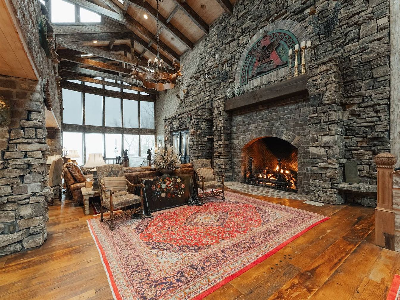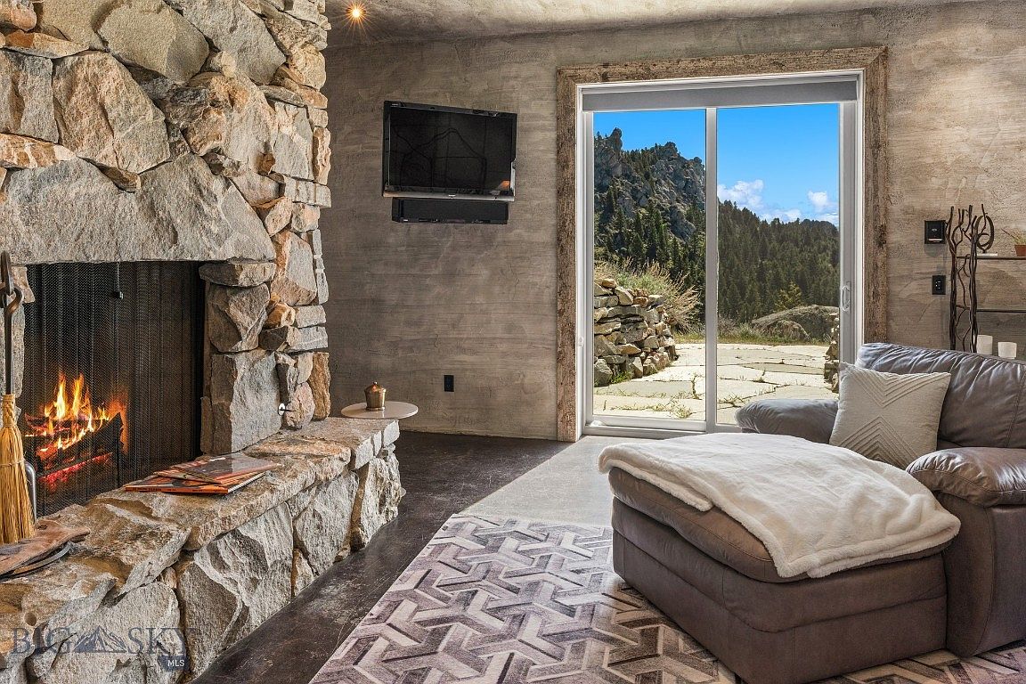 A rustic yet sophisticated living room designed for comfort and family gatherings. The centerpiece is a massive stone fireplace with a blazing fire, creating a warm ambiance perfect for relaxing evenings. Large sliding glass doors open to stunning mountain views, welcoming natural light and offering easy outdoor access for both adults and children. The earthy color palette features textured stone, concrete walls, and neutral tones, complemented by a geometric area rug and plush sectional sofa. Family-friendly touches include soft throw blankets, cushioned seating, and open sightlines, making it ideal for relaxing together or entertaining guests.
