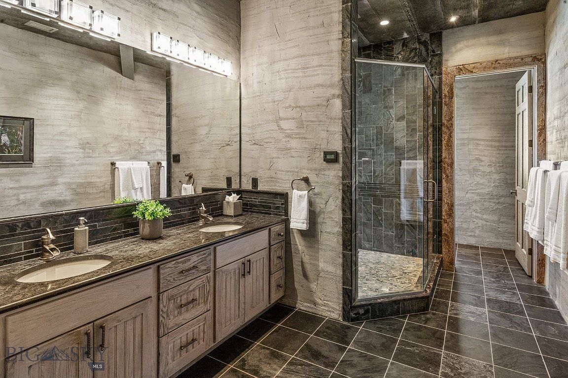 A spacious, contemporary bathroom features a double-sink vanity with sleek, brushed hardware and textured, light wood cabinetry. The rich, granite countertop adds luxury, complemented by glossy black tile accents and a large, well-lit mirror, ideal for everyday routines with the family. Polished stone floors flow seamlessly into the oversized, glass-enclosed shower, which is clad in dramatic slate tiles and includes a pebbled floor for added comfort and style. Neutral wall tones provide a subtle contrast, while abundant towel racks and thoughtful storage highlight both convenience and family-friendliness. A touch of greenery and modern fixtures complete this sophisticated, welcoming space.