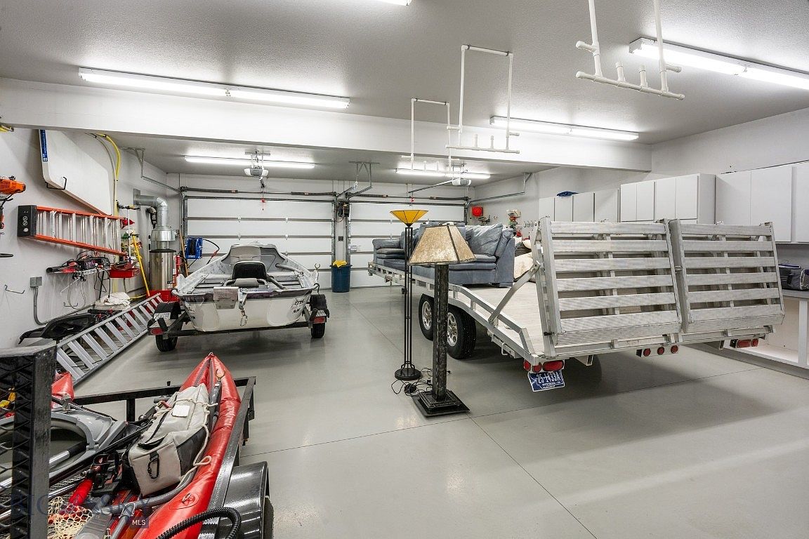 A versatile and well-organized garage featuring epoxy-coated floors, ample overhead lighting, and dual garage doors for easy access. This multi-functional space offers plenty of room for recreational vehicles, like a boat and kayaks, as well as a large trailer. Wall-mounted racks, hooks, and cabinets provide abundant storage for tools, ladders, and outdoor gear, making it ideal for active families. Neutral grey and white color tones contribute to a clean, modern feel. The garage’s generous layout allows for both work projects and leisure, ensuring safety and convenience for every member of the household.