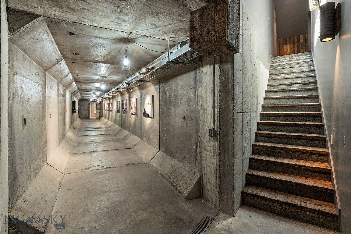 A striking concrete hallway stretches out from the base of a wide, rugged staircase, offering a dramatic and resilient space likely designed as a safe room or modern bunker. Bare concrete walls and ceiling create a robust, industrial aesthetic balanced by warm ambient lighting and curated artwork along one wall, providing an unexpected gallery feel. The staircase with wooden treads leads to upper living areas, signaling easy access for families seeking security and peace of mind. The neutral palette of grays and natural wood tones combines functionality and contemporary style, while the spacious passage encourages movement and safety for all household members.