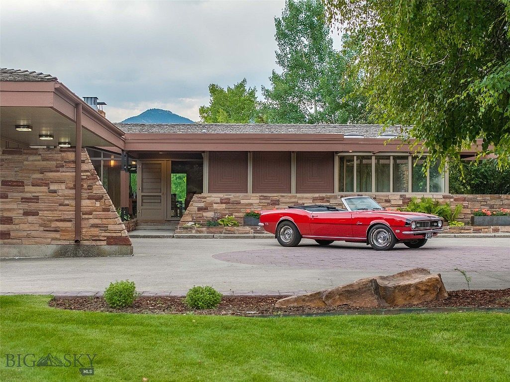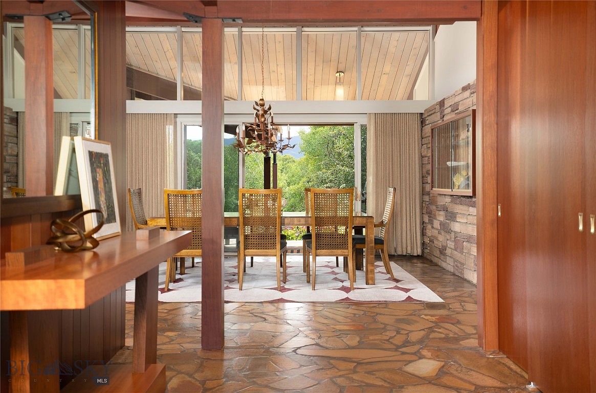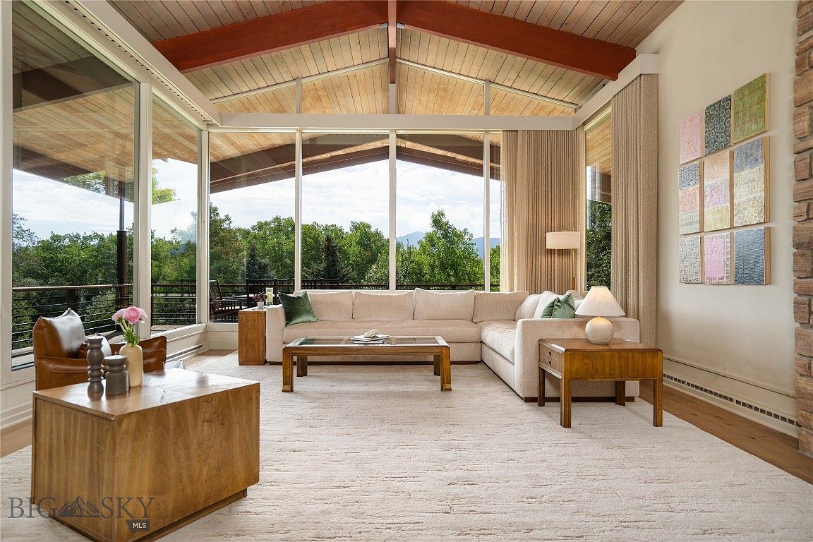 This iconic mid-century modern home, crafted by renowned Bozeman architect Ozzie Berg in 1959, exudes historical significance and timeless status appeal, having been cherished by a single family since 1972. Perfect for the success-driven and future-oriented, it sits proudly on a rare 1.2-acre elevated lot on Spring Creek Drive, boasting breathtaking views of Mount Ellis and the Bridger Mountains, as well as direct access to Bozeman Creek and the city trail system. The 4,500+ sq ft residence exhibits classic mid-century features like vaulted ceilings, floor-to-ceiling glass, dramatic cantilevered roofs, and quality materials such as Ipe decking and cherry wood paneling. Recently updated and meticulously maintained, this $3,250,000 property seamlessly blends indoor and outdoor living within a prized private setting.
