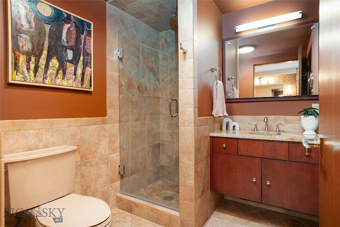 Warm earth tones and natural textures create an inviting ambiance in this well-appointed bathroom. A spacious glass-enclosed shower features elegant, light-brown tilework that extends to the walls and floor, lending a cohesive and clean look. The contemporary vanity offers deep wood cabinets for ample storage, topped with a granite countertop and accented by sleek fixtures. Soft lighting above the mirror makes the space welcoming and functional for everyday routines. A whimsical framed painting adds personality and charm, while thoughtful details like coordinated towels and decor make this a family-friendly and comfortable retreat for all ages.
