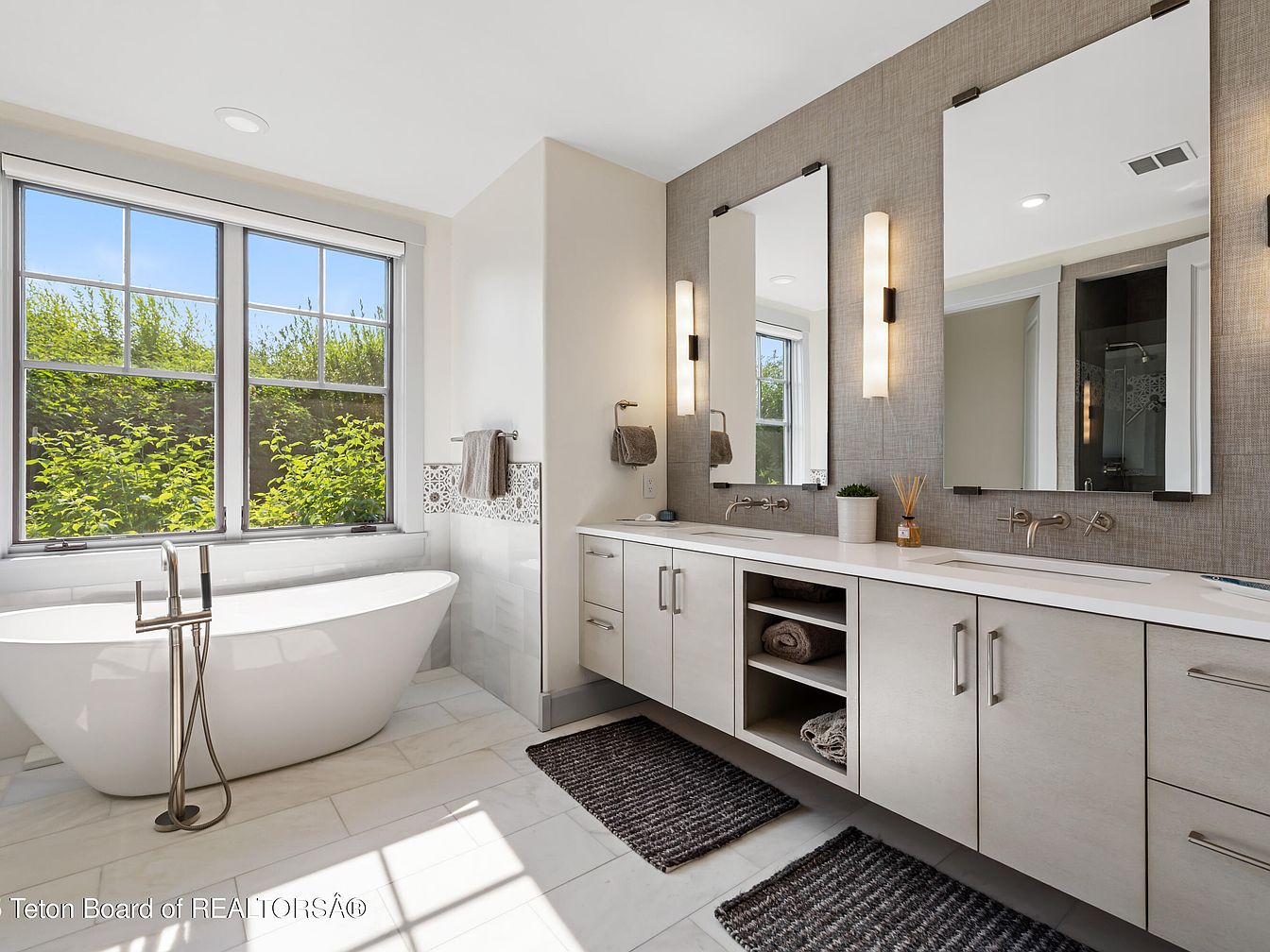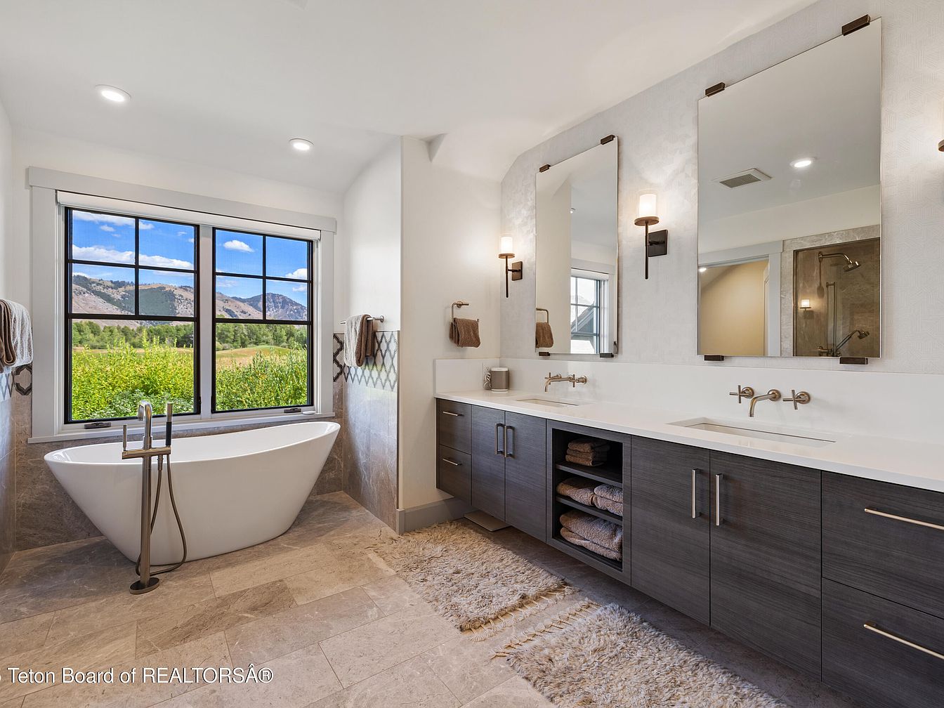 Discover a serene master bathroom retreat, featuring a luxurious freestanding tub positioned beneath a grand window that frames breathtaking mountain views. The dual vanities boast dark wood cabinetry, providing ample storage and showcasing elegant bronze faucets that blend warmth with sophistication. Stylish sconces illuminate the space, while textured wallpaper adds a soft touch to the contemporary design. Spacious and airy, this bathroom invites natural light, enhancing the calming color palette of soft whites and earthy tones. The polished marble flooring complements plush rugs, creating a welcoming atmosphere ideal for relaxation and rejuvenation.