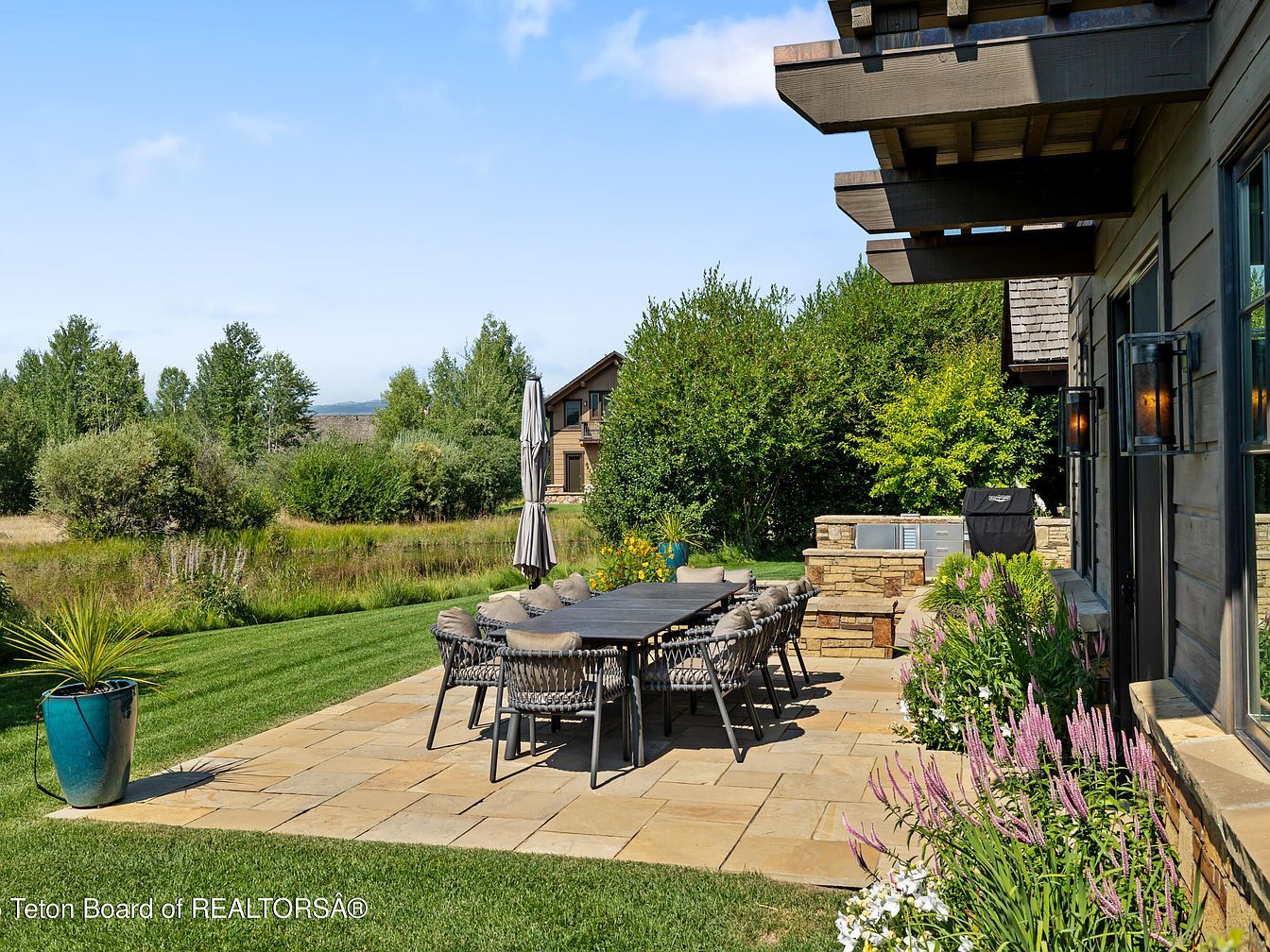 A spacious outdoor patio area blends seamlessly with the lush landscape, ideal for family gatherings or relaxing evenings. The large rectangular dining table, surrounded by comfortable, woven chairs, invites leisurely meals under the sun. A stylish, retractable umbrella provides shade, while the soft textures of surrounding greenery offer a vibrant backdrop. Architectural elements such as stone walls and wooden overhangs enhance the home’s natural aesthetics and provide a rustic charm. Decorative potted plants and blooming flower beds add color and warmth, creating a welcoming atmosphere perfect for entertaining guests or enjoying quiet moments outdoors.