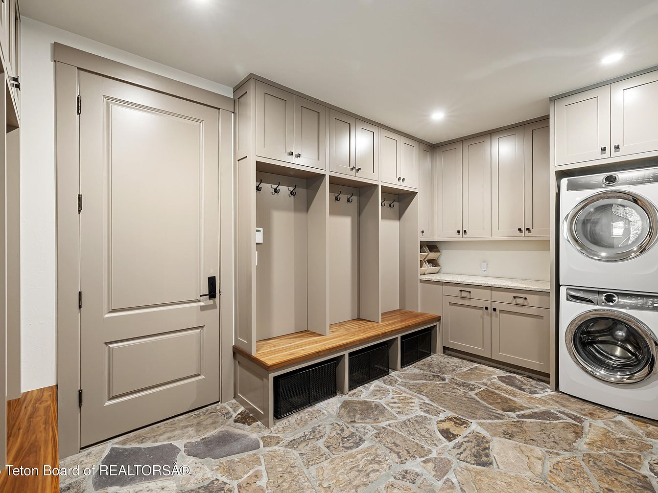 This inviting mudroom seamlessly blends practicality with style, showcasing a rich palette of soft taupe cabinetry paired with warm wooden accents. The custom built-in seating area features a classic bench that is both functional and aesthetically pleasing, providing ample space for storage. Six strategically placed hooks ensure ease of access for coats and bags, promoting organization in a busy household. The striking stone flooring adds a rustic charm while being durable for heavy foot traffic. Modern appliances stand ready for laundry duties, making this space a perfect blend of convenience and thoughtful design for family living.