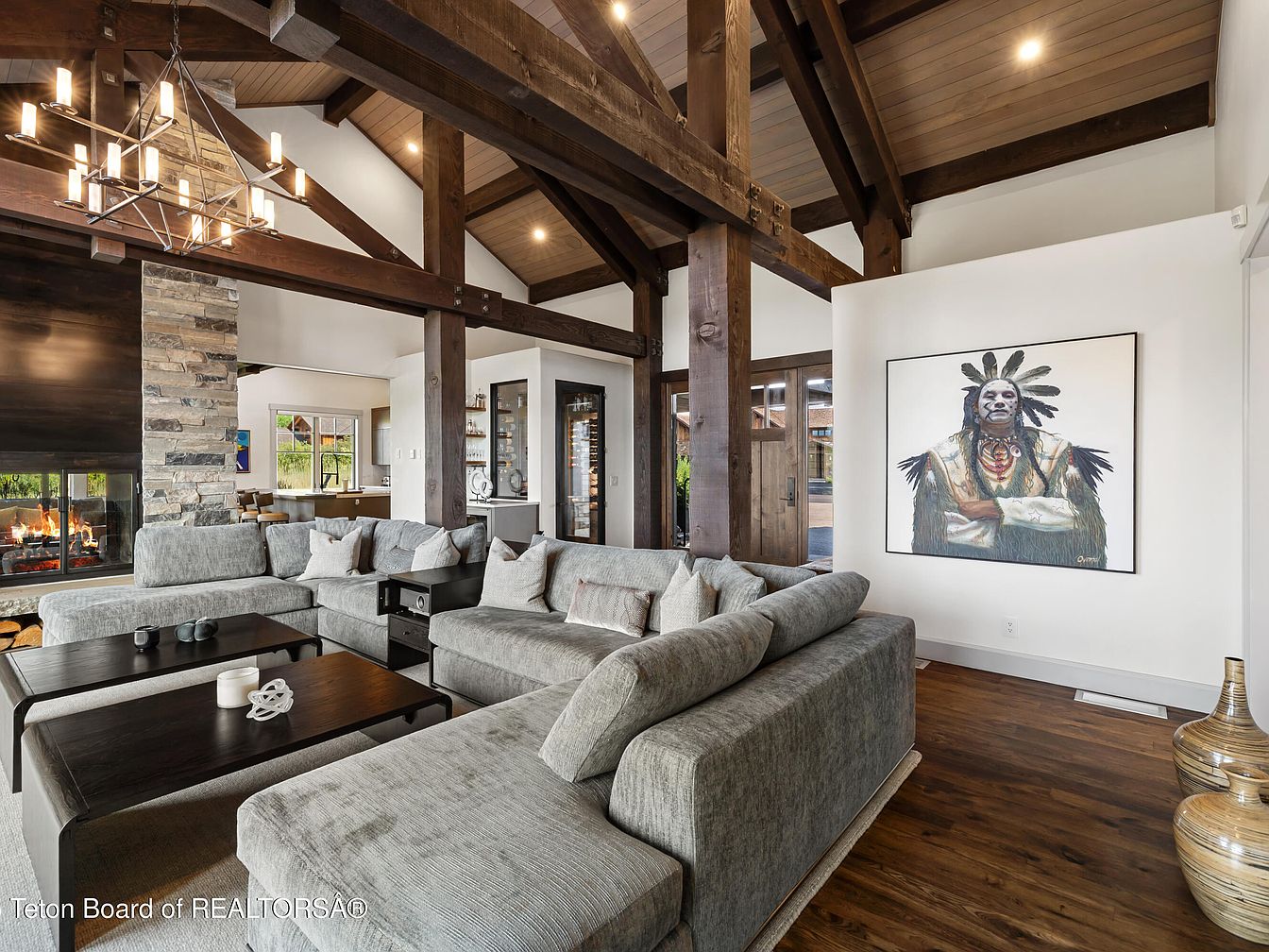 This inviting living room boasts a striking blend of modern and rustic elements. Grand wooden beams stretch across the high ceilings, adding architectural interest alongside the stone-clad fireplace, which serves as a stunning focal point. A spacious sectional sofa in soft gray invites relaxation, while dark coffee tables provide contrast and function. Natural light pours in through large windows, enhancing the warm, neutral color palette. Family-friendly features include durable fabrics and cozy seating arrangements. Art pieces, particularly a captivating portrait on the wall, add character and personal touch, creating a harmonious space perfect for gatherings or quiet evenings.