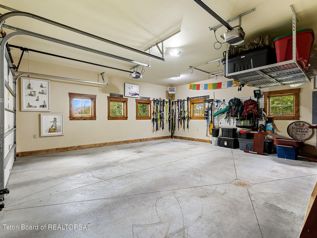 This garage features a spacious layout, perfect for family activities and storage needs. High ceilings accommodate overhead storage units, maximizing space efficiency. Natural light pours in through the well-placed windows, illuminating the cement flooring and enhancing the overall brightness. Stylish wooden frames around the windows complement the cream-colored walls, adding warmth to the environment. Organized racks display outdoor gear, contrasting with the sleek, functional aesthetics. A dedicated area is set up for tools and projects, making it convenient for DIY enthusiasts. This garage successfully integrates practicality and design, making it a versatile space for any American family.