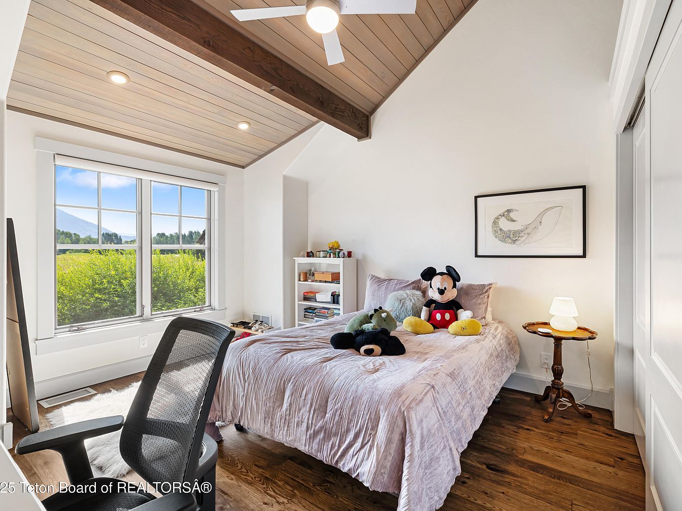 The cozy kid’s bedroom features a pitched ceiling with rustic wooden beams, enhancing the open and airy feel. Soft, pastel-hued bedding complements the light wall colors, creating a serene atmosphere. A plush area rug adds warmth underfoot. The room is designed for comfort, highlighted by a charming assortment of stuffed animals on the bed, adding a playful element. Natural light floods through large, double-hung windows, offering stunning views of the outdoors. A small study area with a sleek chair encourages learning and creativity, while a minimalist bookshelf keeps toys and books organized, fostering a tidy and inviting space.