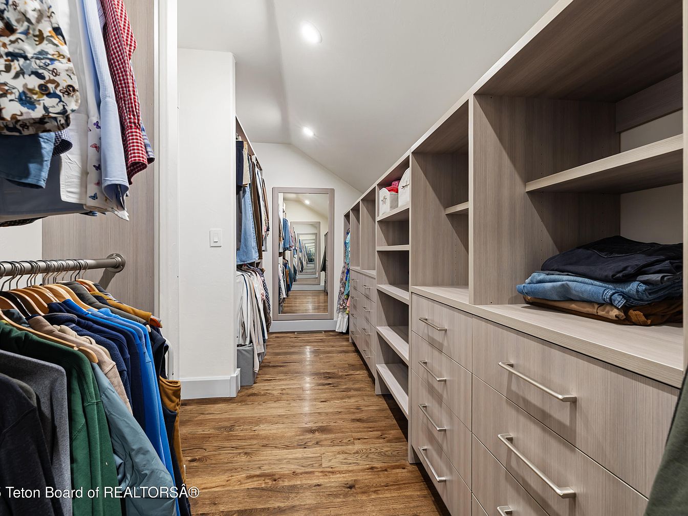 A modern walk-in closet featuring a sleek and efficient layout. Natural light floods the space, highlighting the beautiful warm wood flooring and the soft beige tones of the cabinetry. Ample shelving and drawers provide organized storage solutions, making it easy to find and display clothing. The mirrored wall amplifies the spacious feel, allowing for a full view of outfits. Hanging rods accommodate a variety of garments, from shirts to formal wear, ensuring everything has its place. Thoughtful design elements, including minimalist handles and structured shelving, create a contemporary yet inviting atmosphere ideal for any family.