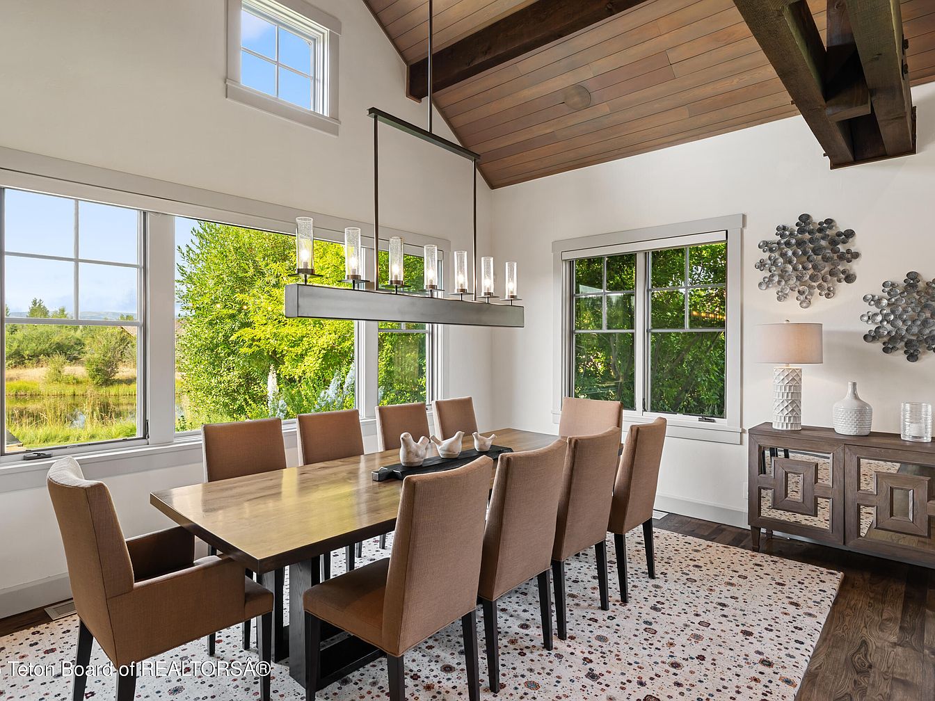 Featuring a bright and inviting dining room, this space showcases a large wooden table surrounded by plush, upholstered chairs, perfect for family gatherings. The high, vaulted ceiling with rich wooden beams adds architectural interest, while large windows invite natural light and frame picturesque views of the greenery outside. A modern light fixture hangs elegantly above the table, emphasizing the room’s contemporary charm. The neutral color palette, accented by earthy tones in the chairs and a textured rug, creates a warm and welcoming atmosphere, making this dining area an ideal spot for both casual meals and festive celebrations.