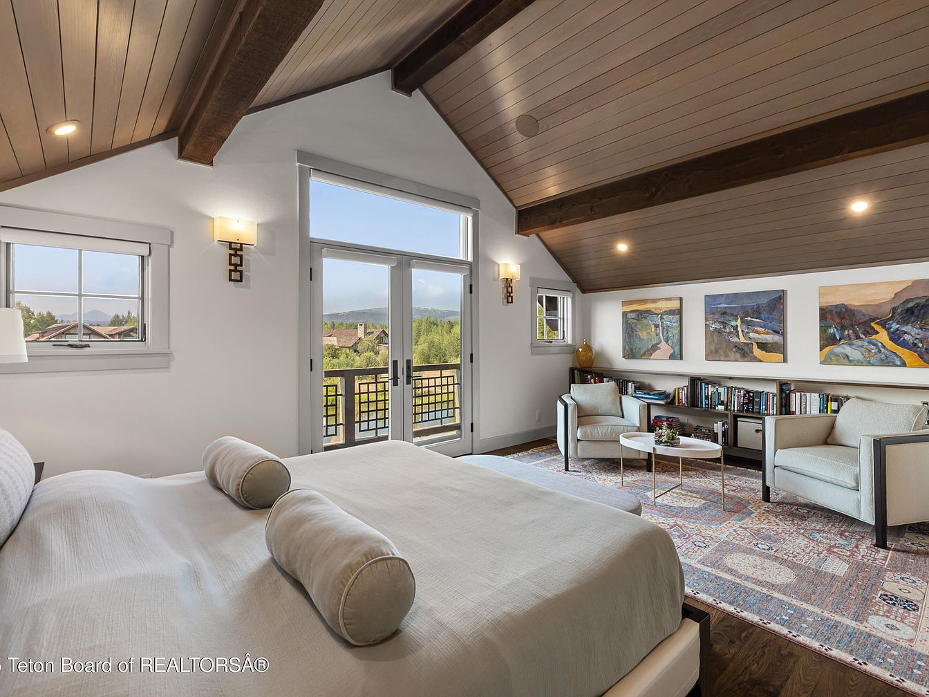 This stunning master bedroom features vaulted ceilings adorned with rich wooden beams, creating an inviting atmosphere. A large window and glass doors frame breathtaking mountain views, flooding the space with natural light. Soft, neutral tones dominate the color scheme, while plush furniture, including two elegantly curved chairs, fosters relaxation. The thoughtfully arranged layout encourages family gatherings, complemented by a cozy area rug that adds warmth underfoot. Artistic wall accents bring a personal touch, and built-in shelving houses books and décor, enhancing the room’s charm and functionality. This tranquil retreat seamlessly merges comfort with style.