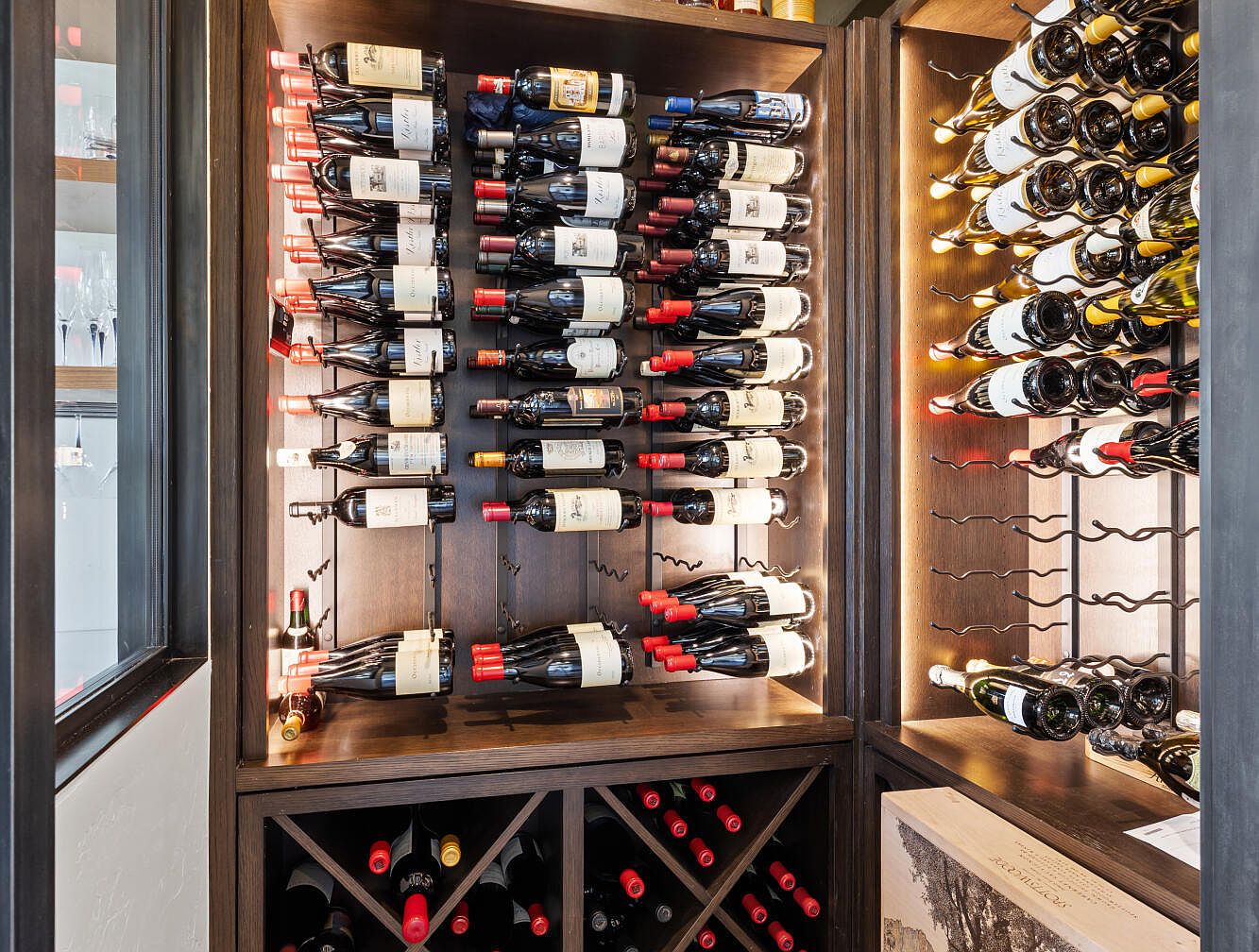 This stylish wine storage area showcases a clever design combining functionality with elegance. Rich wooden shelves are perfectly arranged to hold an impressive collection of bottles, emphasizing accessibility and organization. Sleek metal wine racks provide a modern touch while enhancing the visual appeal. The warm color palette of deep browns and soft whites creates a cozy ambiance, perfect for entertaining guests. Soft, integrated lighting accentuates the wine labels, adding sophistication to the space. Family-friendly features include easy access for all ages, ensuring gatherings are enriched by shared experiences and delightful conversations centered around fine wines.