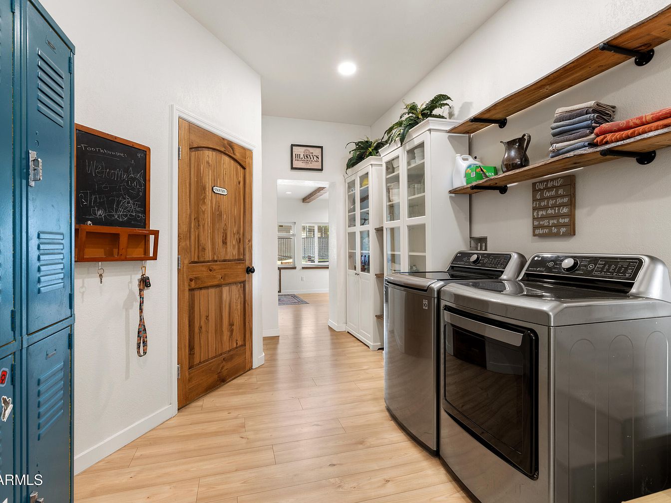 This inviting laundry room features a harmonious blend of functionality and style. Modern appliances, including sleek washers and dryers, are positioned conveniently along the wall, optimizing space for chores. A rustic wooden countertop above adds practicality and warmth, complemented by floating shelves displaying neatly folded towels. The vibrant blue locker offers a whimsical touch, enhancing the room’s playful charm. Soft, neutral tones on the walls combined with light wood flooring create a bright, airy atmosphere. A chalkboard communicates a welcoming message, making this space not just a spot for laundry, but a hub of family activity and organization.