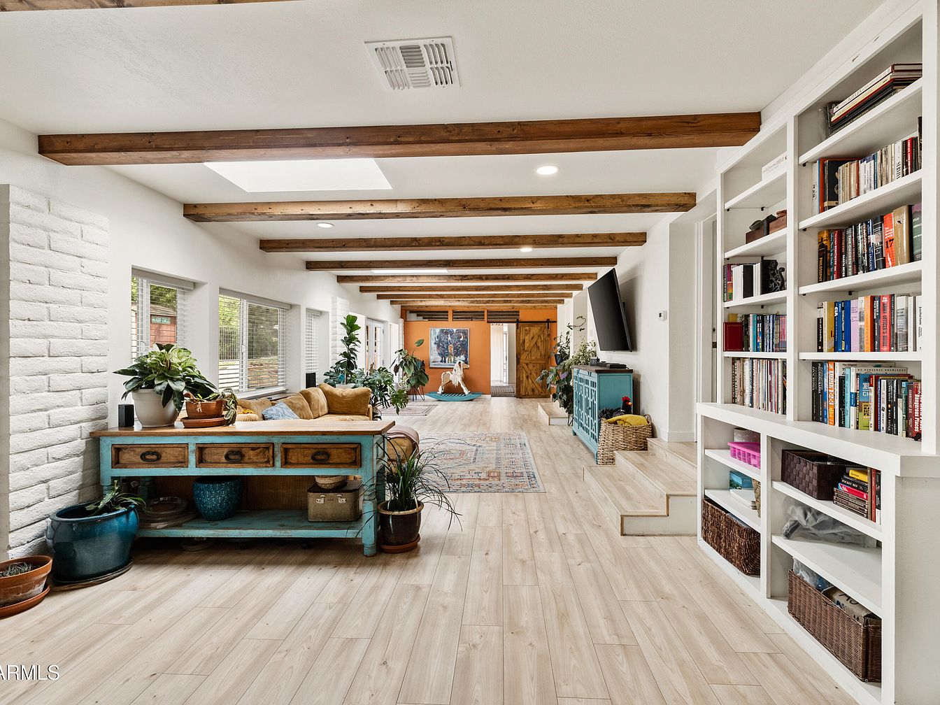 Featuring a harmonious blend of modern and rustic elements, this living space showcases exposed wooden beams and a spacious layout that invites warmth and comfort. Natural light floods through large windows, illuminating the soft, neutral color palette accented by vibrant furnishings, including a unique blue console table. Family-friendly features abound, with ample seating on a cozy couch adorned with colorful cushions and a decorative area rug adding character. A built-in bookshelf offers both storage and a stylish display for books and decor. Lush indoor plants bring an organic touch, enhancing the inviting atmosphere for gatherings.