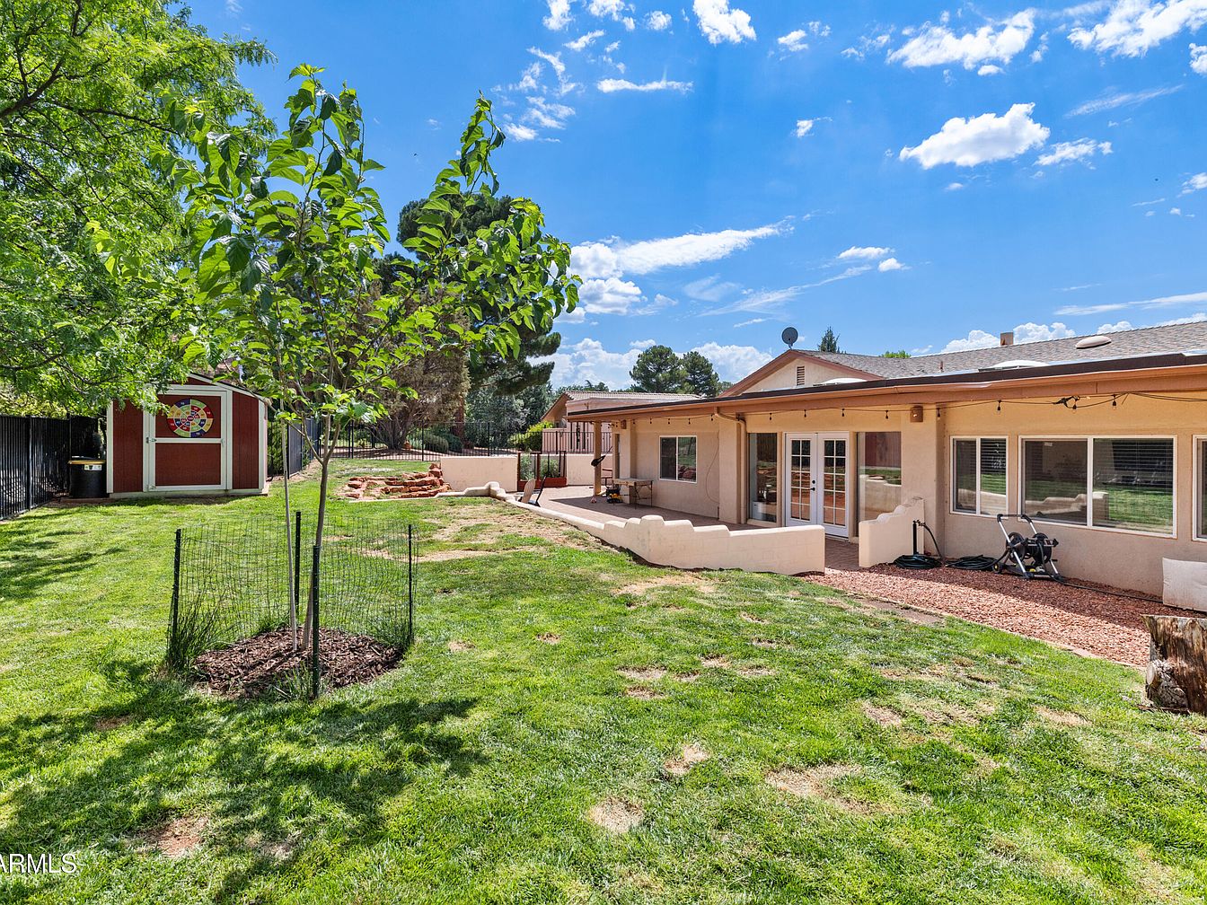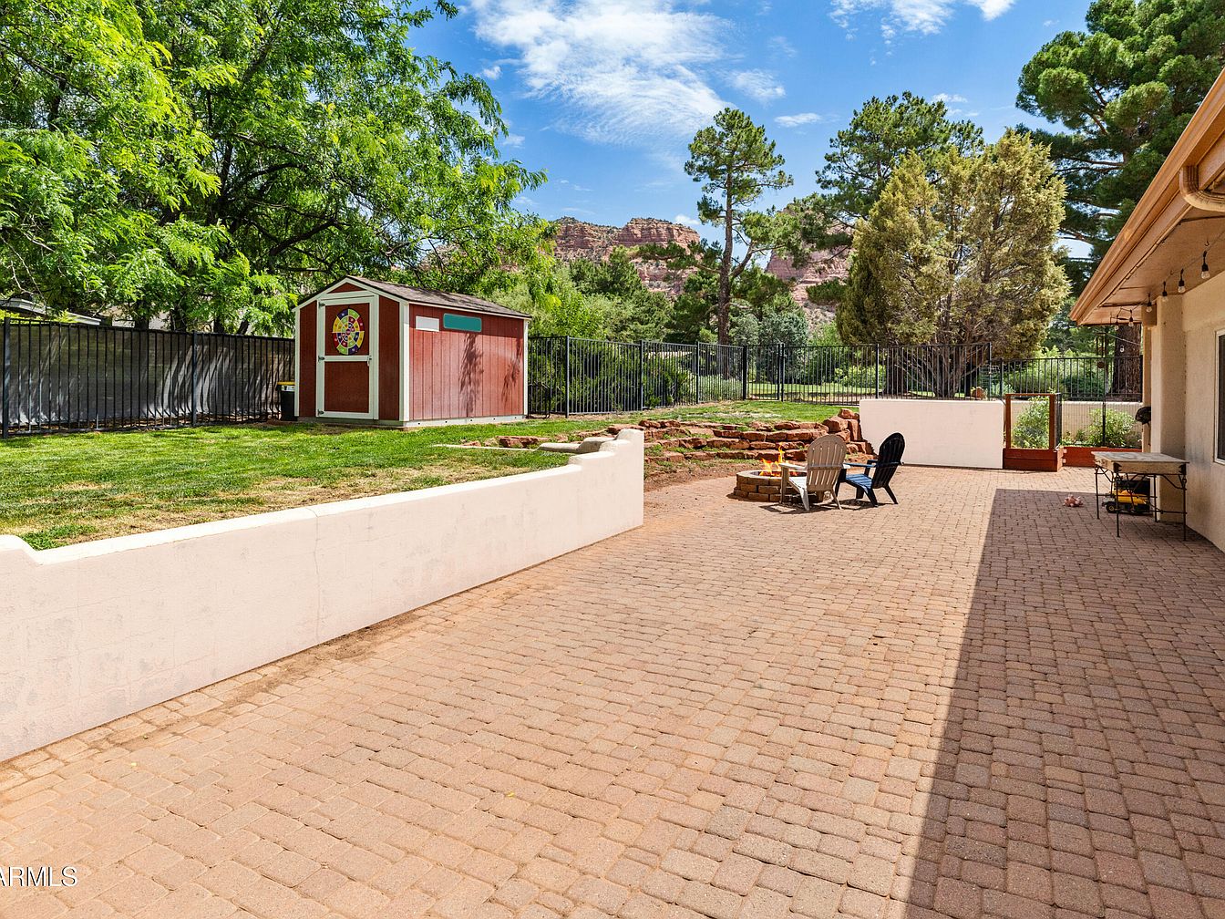 This outdoor patio features a beautifully laid paver stone surface, creating an inviting area for relaxation and gatherings. The spacious layout accommodates comfortable seating with two adirondack chairs facing a charming fire pit, perfect for evening conversations or weekend barbecues. Lush greenery surrounds the space, enhancing the natural feel while providing shade during hot summer days. A neatly painted shed adds a whimsical touch and practical storage for gardening tools or outdoor supplies. The fenced yard ensures security for families and pets, while the backdrop of towering trees and distant cliffs offers a stunning natural view.