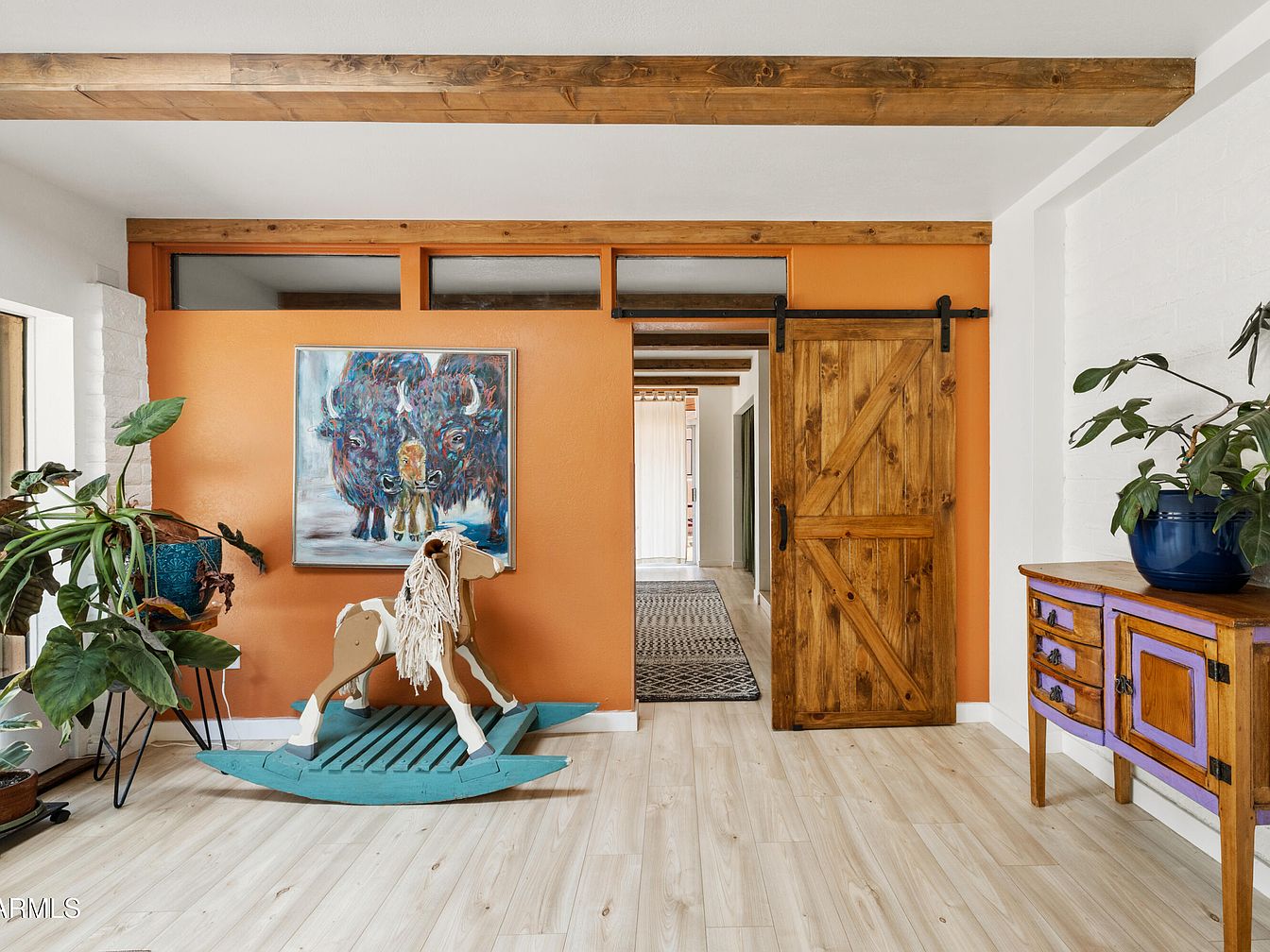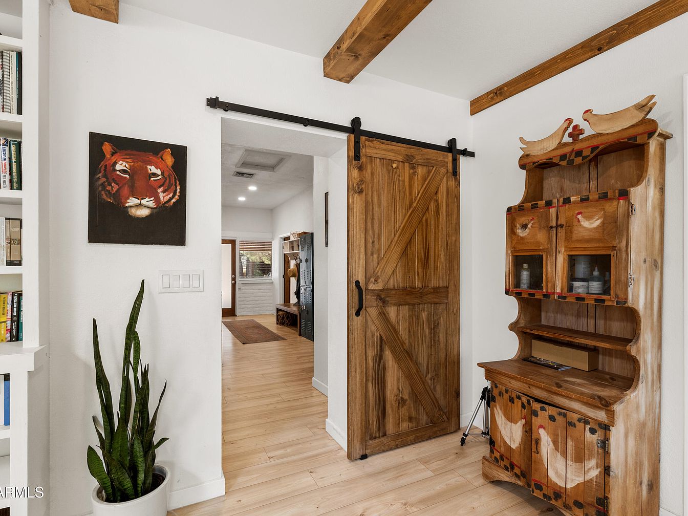 This inviting entryway captivates with its rustic charm and thoughtful design. The warm wooden beams overhead contrast beautifully with the bright white walls, creating a cozy ambiance. A sliding barn door adds a modern touch while maintaining the home’s farmhouse aesthetic. To the side, a charming antique cabinet adorned with painted chickens serves not just as decor but as a functional space for storage. A tall snake plant in a sleek pot introduces a pop of greenery, enhancing the welcoming atmosphere. Natural light floods in from the doorway at the end, inviting residents to explore the warmth of home.