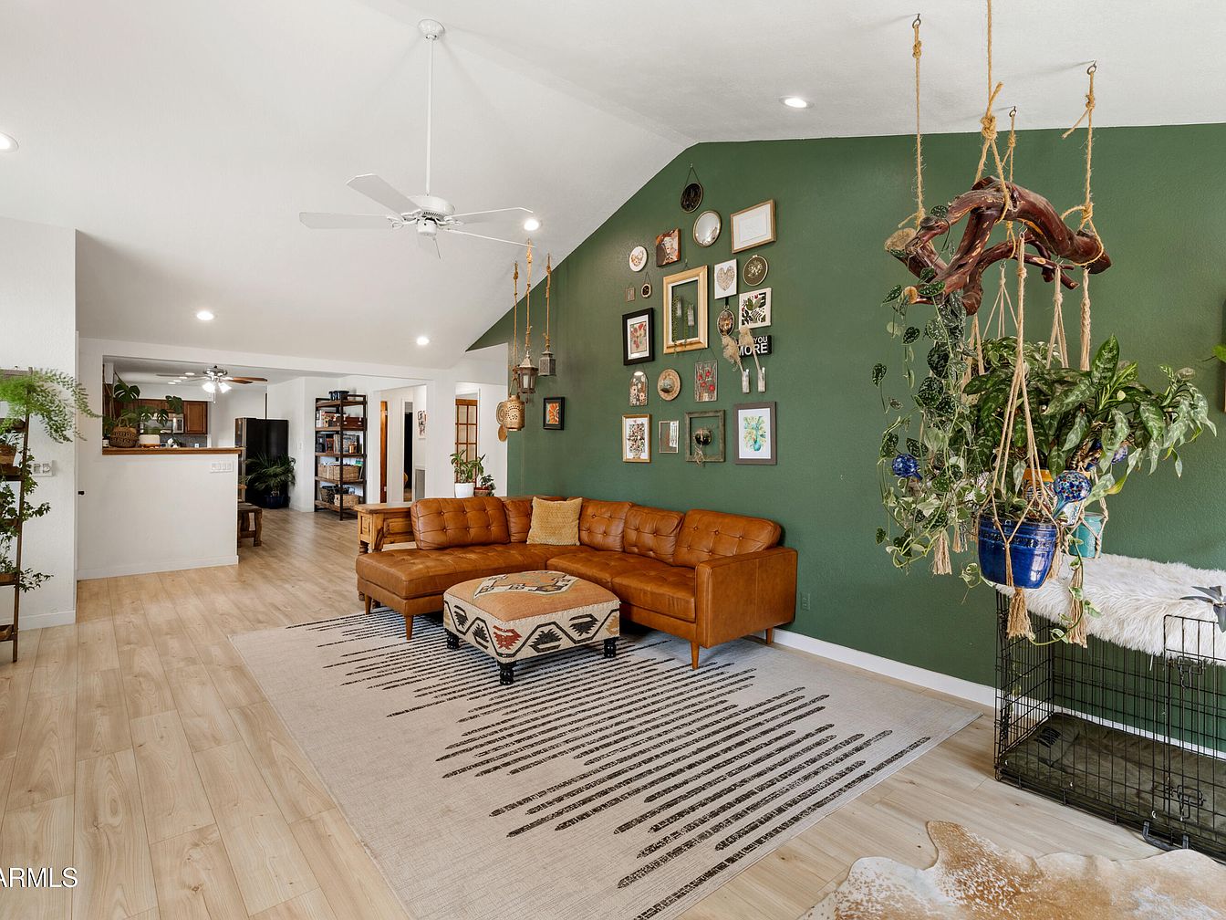 This inviting living room embraces a warm, family-friendly aesthetic, highlighted by a luxurious leather sectional sofa that offers ample seating for gatherings. The earthy green accent wall serves as a vibrant backdrop for an eclectic array of framed artwork, adding a personalized touch. Light wood flooring complements the neutral color palette, enhancing the open and airy atmosphere. A central area rug with bold patterns anchors the space, while hanging planters bring a touch of nature indoors. The layout encourages interaction, seamlessly connecting to the kitchen, making it a perfect hub for family activities.