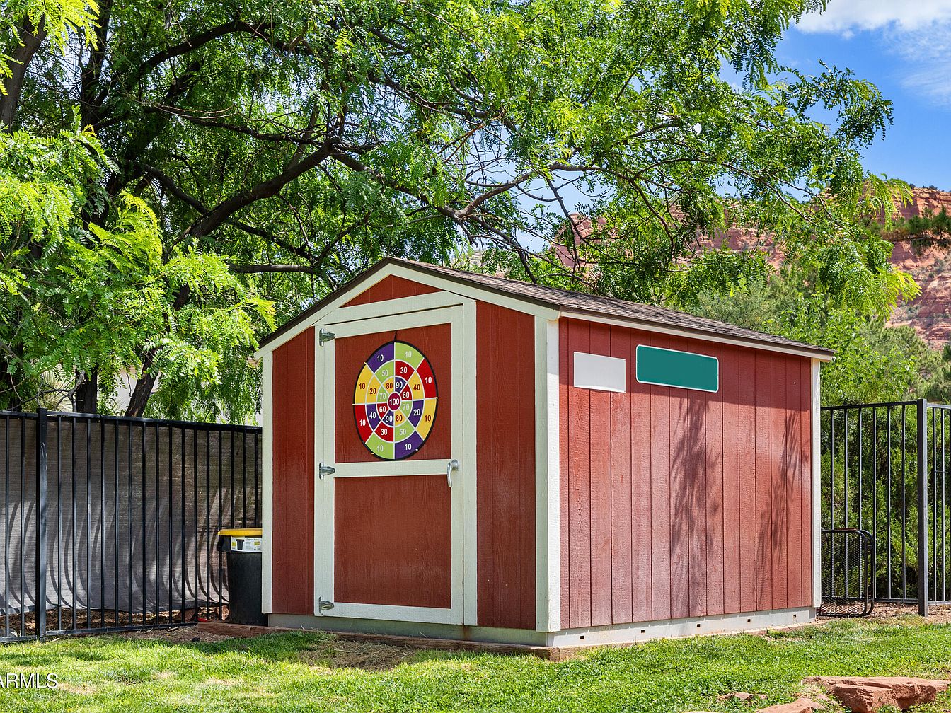 This inviting garden shed presents a charming blend of functionality and aesthetic appeal, making it a delightful addition to any outdoor space. Its vibrant red siding with white trim contrasts beautifully against the lush green landscaping, creating a vibrant focal point. The playful dartboard design on the door adds a fun, family-friendly element, encouraging outdoor games and gatherings. Surrounded by mature trees and well-maintained grass, this shed provides ample storage for gardening tools and outdoor toys. The structured lines and peaked roof enhance its classic design, promoting a welcoming atmosphere in the backyard.