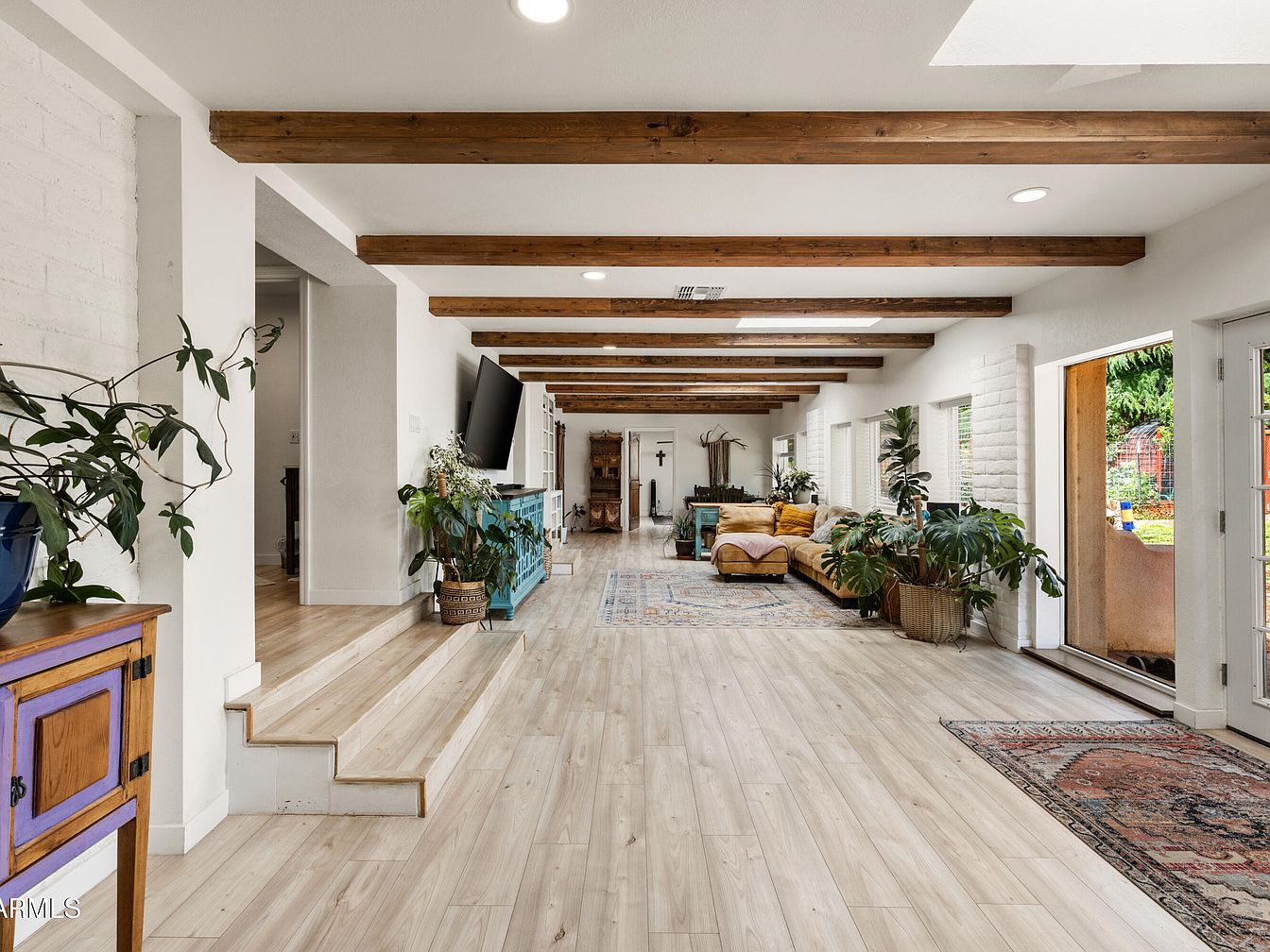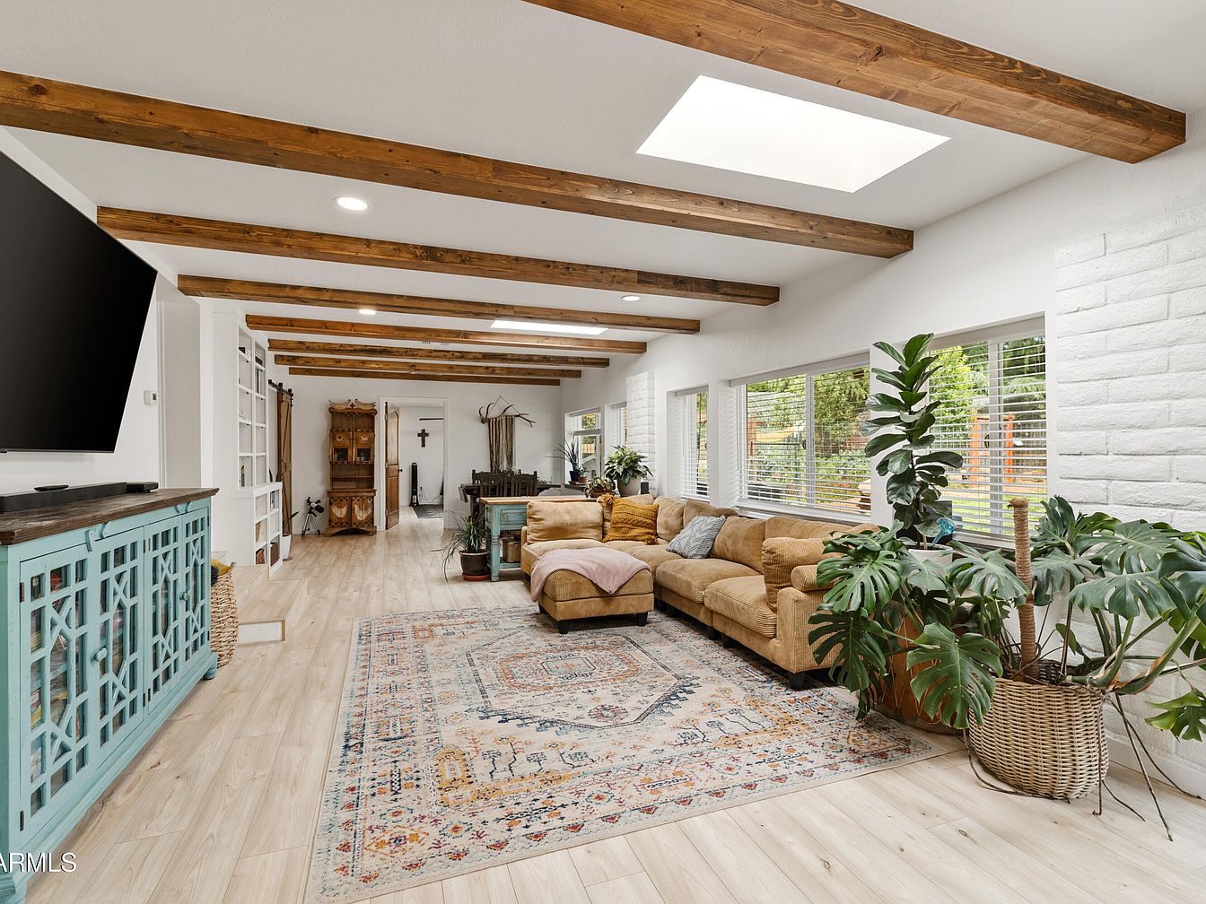 Revel in the inviting ambiance of this spacious living room, featuring exposed wooden beams that enhance its airy feel. Elegantly designed with a warm color palette, the plush, beige sectional invites relaxation, while the vibrant area rug adds a touch of personality. Large windows bathe the space in natural light, highlighting the cozy arrangement of plants and tasteful decor. The turquoise sideboard and tasteful wooden accents create a balanced aesthetic, perfect for family gatherings. With its open layout leading to connected spaces, this room embodies a perfect blend of comfort and style, making it ideal for both relaxation and entertainment.
