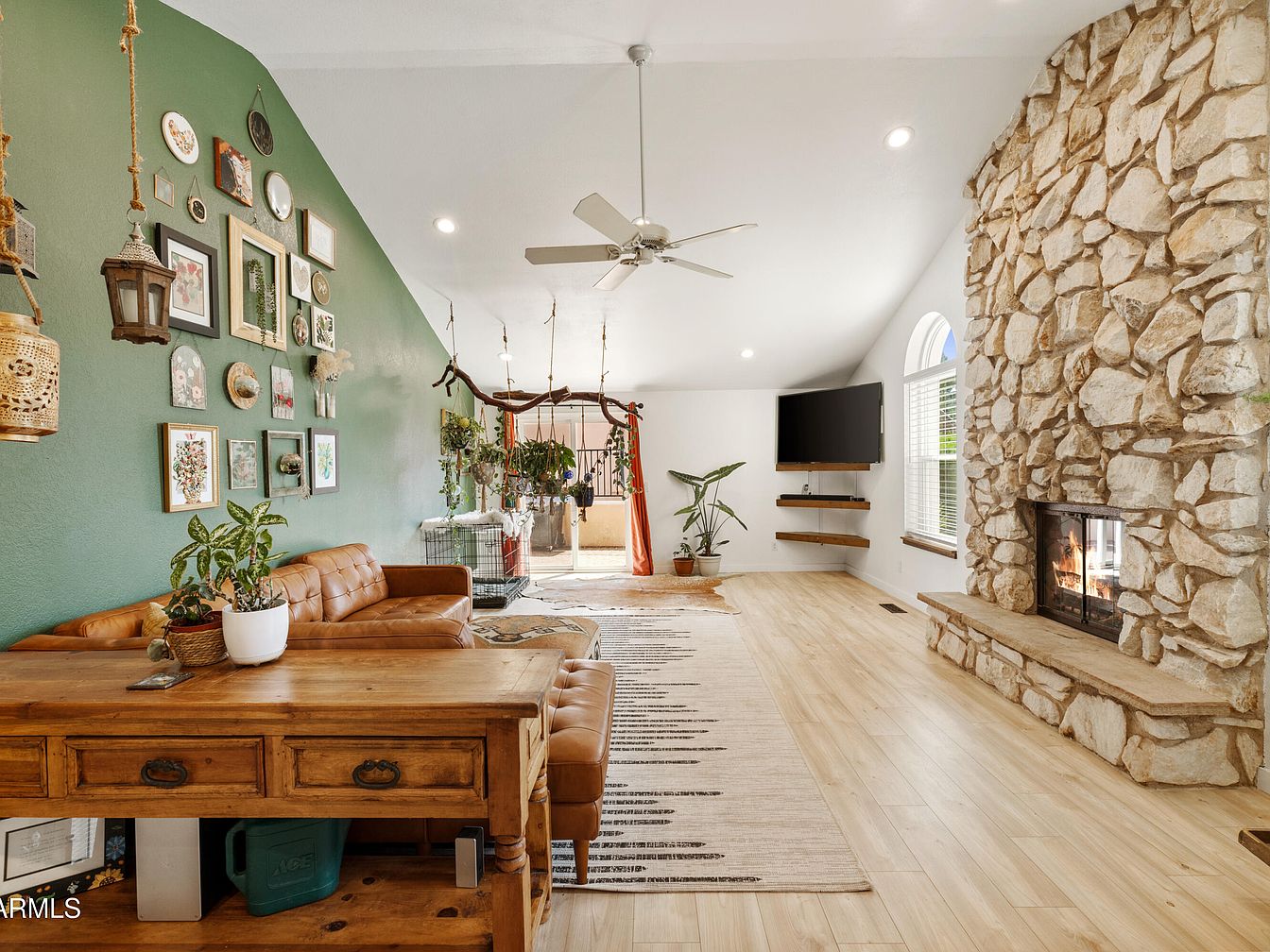 This inviting living room features a seamless blend of modern aesthetics and rustic charm, centered around a stunning stone fireplace that invites warmth. The bold green accent wall is adorned with a curated gallery of framed art and botanicals, while an elegant leather sofa offers a perfect spot for family gatherings. Natural light floods the space through large windows, complemented by a light wood floor that enhances the airy feel. A wooden coffee table adds a touch of practicality, where family activities can thrive. Hanging plants and earthy textures bring life, making it an ideal family-centric haven.
