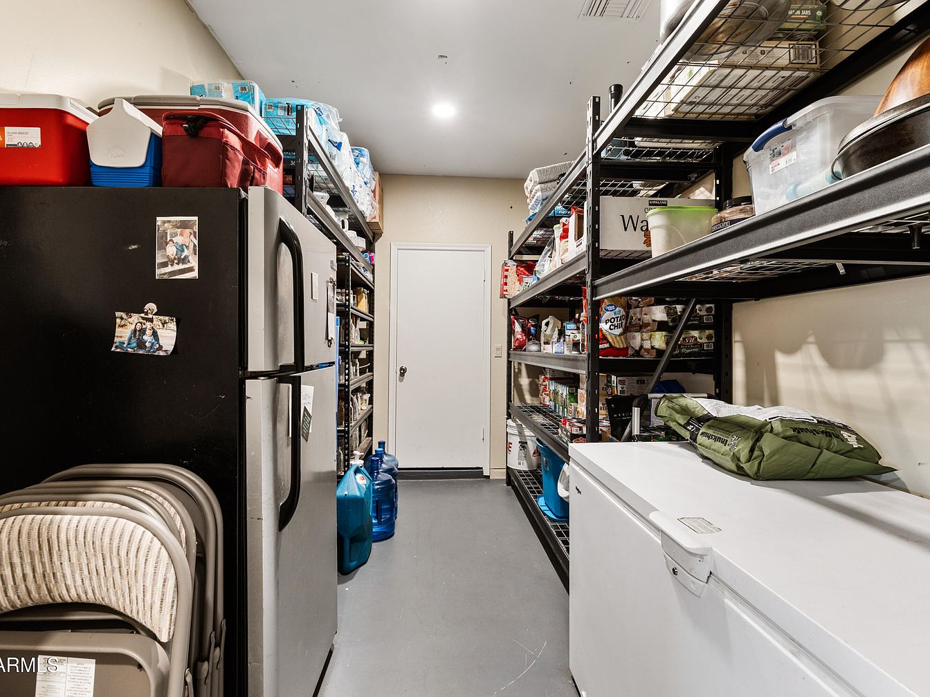This spacious pantry features organized shelving, maximizing storage for various essentials and supplies. A sleek black refrigerator stands against one wall, while neatly arranged shelves hold boxes, jars, and containers, ensuring everything is easily accessible. The overhead lighting enhances the functionality, casting a bright glow on light-colored walls that create an inviting atmosphere. A white chest freezer offers additional cold storage, ideal for families looking to stock up. Folding chairs stacked in one corner provide practical seating options when needed, exemplifying both convenience and thoughtful organization that makes this space highly family-friendly.