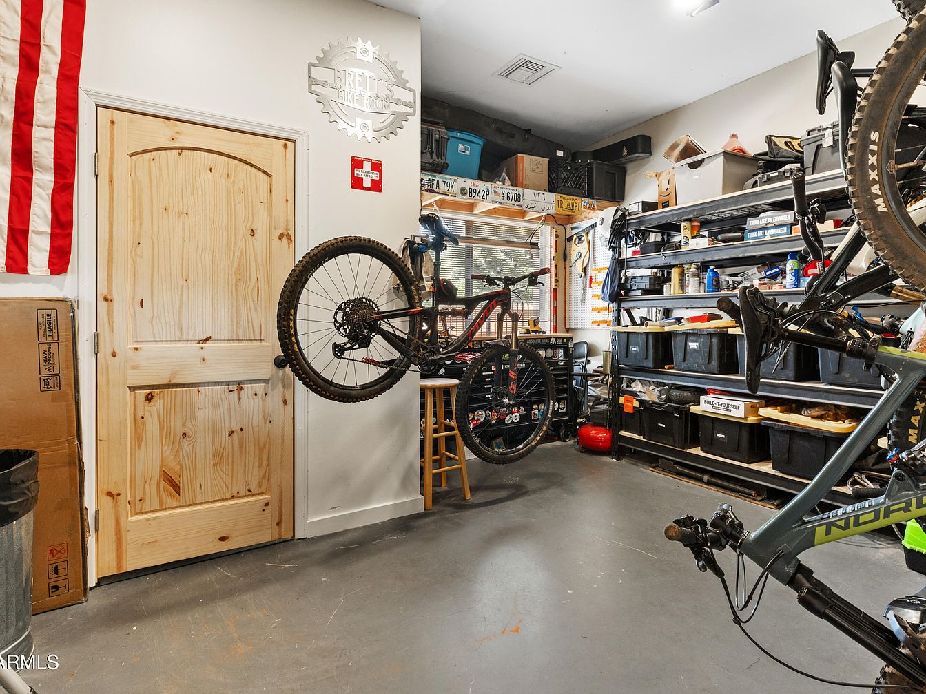 This multifunctional garage showcases an organized and vibrant space perfect for outdoor enthusiasts. The walls, adorned with an American flag, bring a patriotic touch, while functional shelving units display an array of tools and supplies, maximizing storage. Two bikes are prominently featured, hinting at an active lifestyle. The light gray flooring complements the neutral color scheme, enhancing the airy feel. A wooden door adds warmth and character, seamlessly integrating the space with the home’s overall design. With a stool in the corner, the area invites family gatherings or bike maintenance, embodying a practical yet welcoming atmosphere.