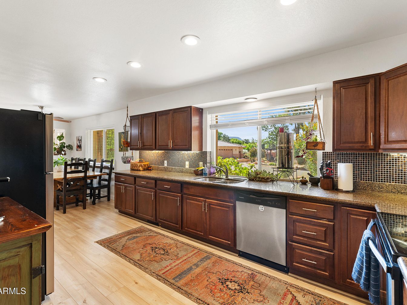 This inviting kitchen features warm wooden cabinetry complemented by sleek granite countertops. The open layout seamlessly connects the cooking area to a cozy dining space, making it ideal for family gatherings. Large windows fill the room with natural light, showcasing views of the outdoors and creating a sense of openness. The stylish backsplash adds a modern touch, while the rich tones of the woodwork exude warmth. Practical appliances are neatly integrated, and thoughtful accents, such as hanging plants and a vibrant area rug, enhance the homely ambiance, making it a perfect space for culinary creativity and shared meals.